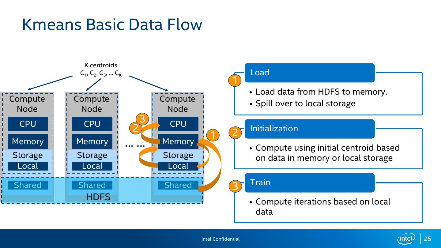 24 . Kmeans in Spark N iterations Loading Step 1: For each record in the cache, Sum the Normalization vectors with the same closet centroid Caching Cache #1 For Each Record in the M0 - Mj (DRAM + DISK) Cache Cache #2 For Each Record in the Mj+1 - Mk (DRAM + DISK) Cache 2 Iterations for all of the cache data Sync Cache #3 For Each Record in the Mk+1 - Mm (DRAM + DISK) to get the K Cache Update the new Centroids centroids in a random mode For Each Record in the … … Cache Cache #N For Each Record in the Mx+1 - Mn (DRAM + DISK) Cache Spark Executor Processes HDFS C1, C2, C3, … CK Step 2: Sum the vectors according to Load Random Initial Centroids Train the centroids and find out the new centroids globally Load the data from HDFS to DRAM (and AEP / SSD if DRAM cannot hold all of the data)(Load), after that, the data will not be changed, and will be iterated repeatedly in Initialization and Train stages. Intel Confidential 24