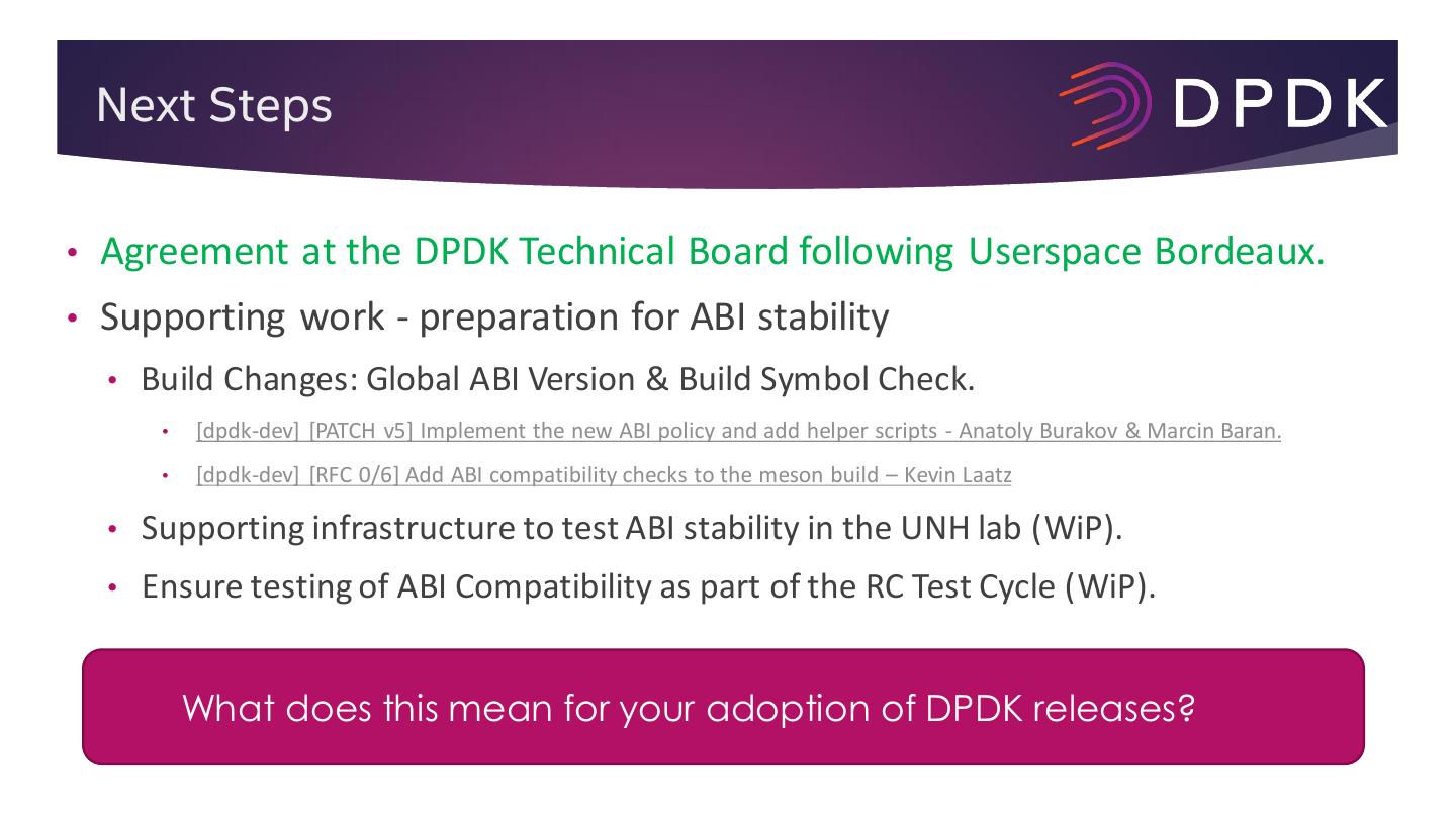 12 . Next Steps • Agreement at the DPDK Technical Board following Userspace Bordeaux. • Supporting work - preparation for ABI stability • Build Changes: Global ABI Version & Build Symbol Check. • [dpdk-dev] [PATCH v5] Implement the new ABI policy and add helper scripts - Anatoly Burakov & Marcin Baran. • [dpdk-dev] [RFC 0/6] Add ABI compatibility checks to the meson build – Kevin Laatz • Supporting infrastructure to test ABI stability in the UNH lab (WiP). • Ensure testing of ABI Compatibility as part of the RC Test Cycle (WiP). What does this mean for your adoption of DPDK releases?