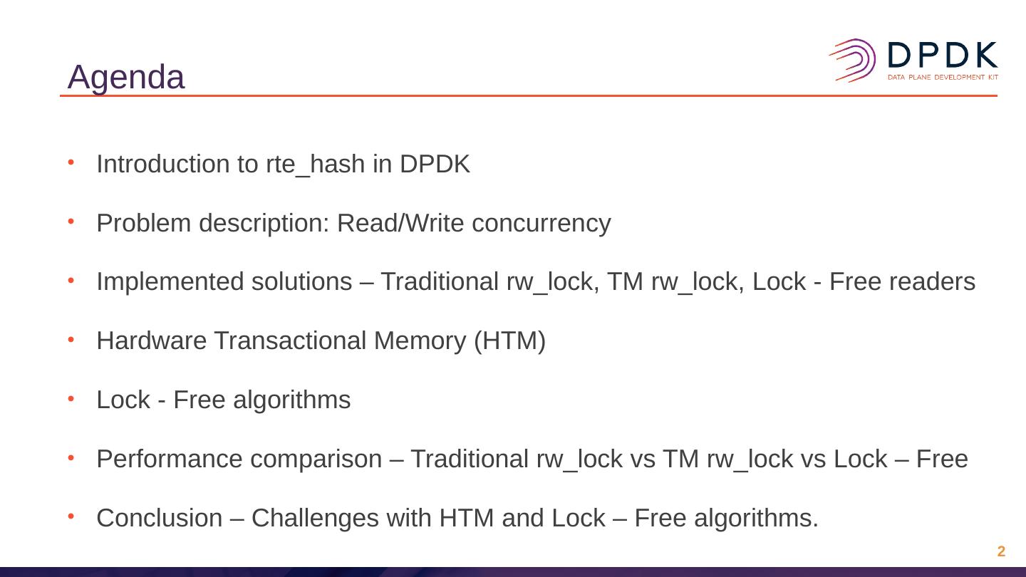 As the number of CPU cores packed in a single SoC increases, scalability of algorithms becomes important. In this presentation, I will talk about Hardware Transactional Memory (HTM) and Lock-Free mechanisms in terms of basic working, requirements, and challenges. Both of these mechanisms improve scalability and thereby speed up the execution of multi-threaded software. DPDK is in a unique position wherein the rte_hash library implements an HTM optimized algorithm as well as a lock-free algorithm. This presentation will further talk about the performance comparison of HTM and Lock-Free in rte_hash library.