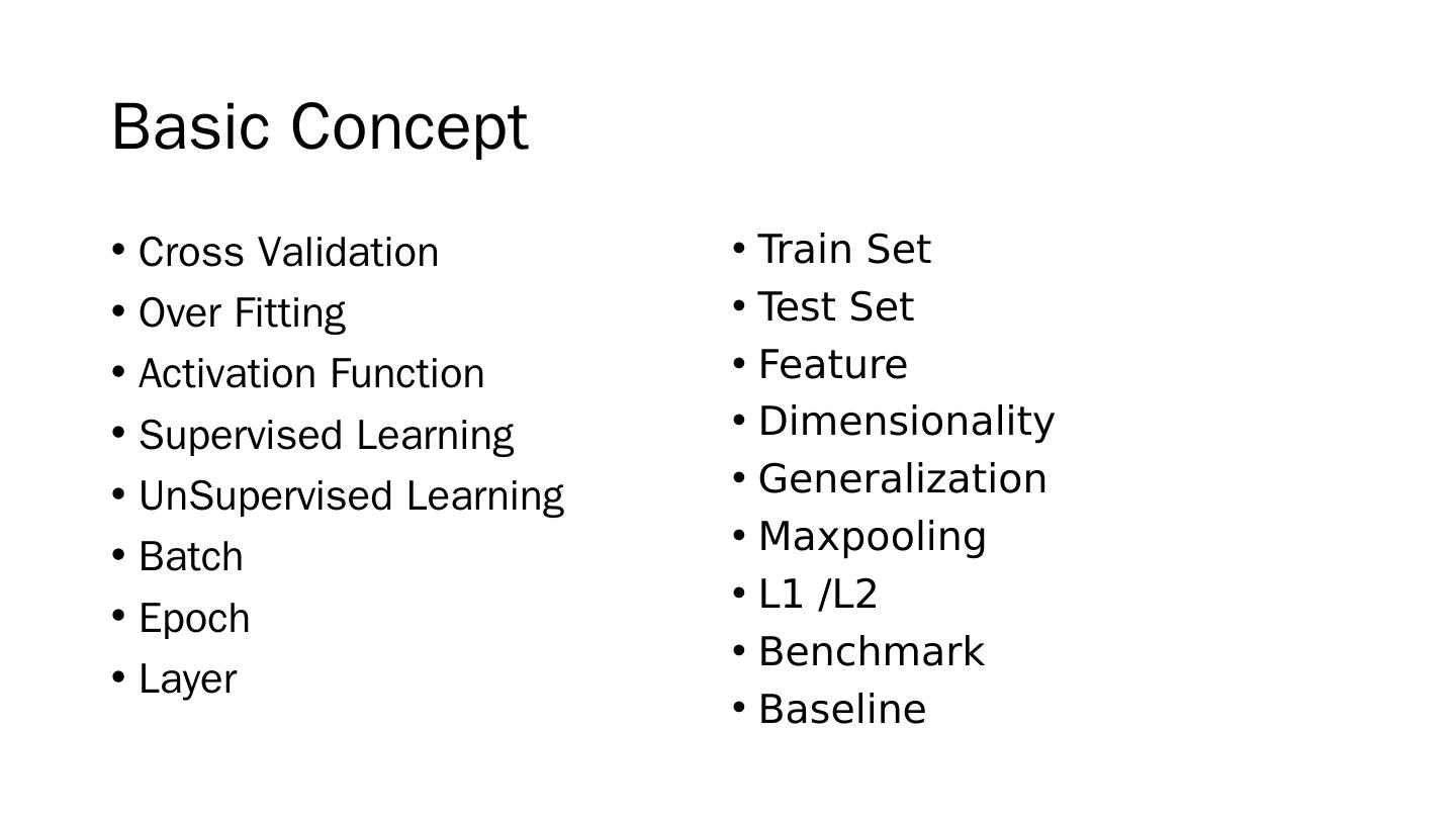 4 .Basic Concept Cross Validation Over Fitting Activation Function Supervised Learning UnSupervised Learning Batch Epoch Layer Train Set Test Set Feature Dimensionality Generalization Maxpooling L1 /L2 Benchmark Baseline