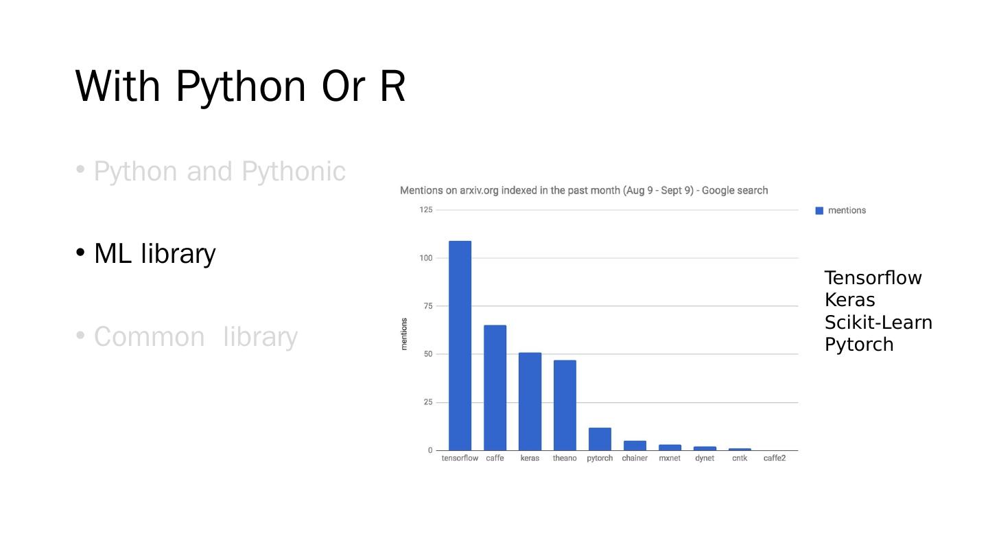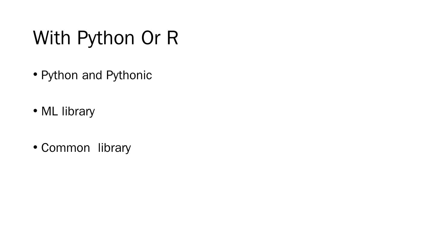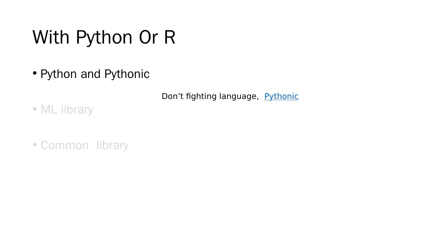17 .With Python Or R Python and Pythonic ML library Common library Don’t fighting language, Pythonic