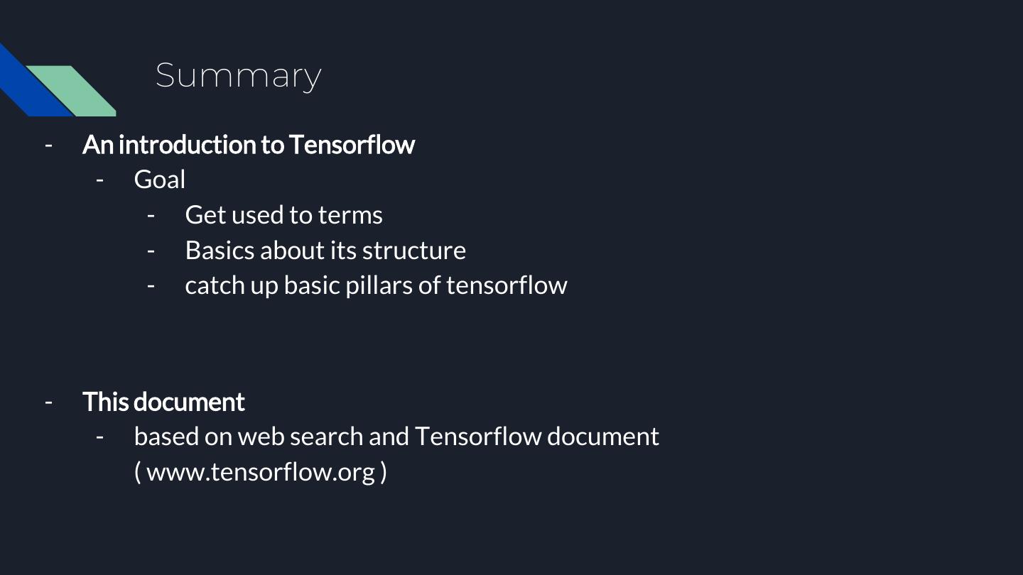2 . Summary - An introduction to Tensorflow - Goal - Get used to terms - Basics about its structure - catch up basic pillars of tensorflow - This document - based on web search and Tensorflow document ( www.tensorflow.org )