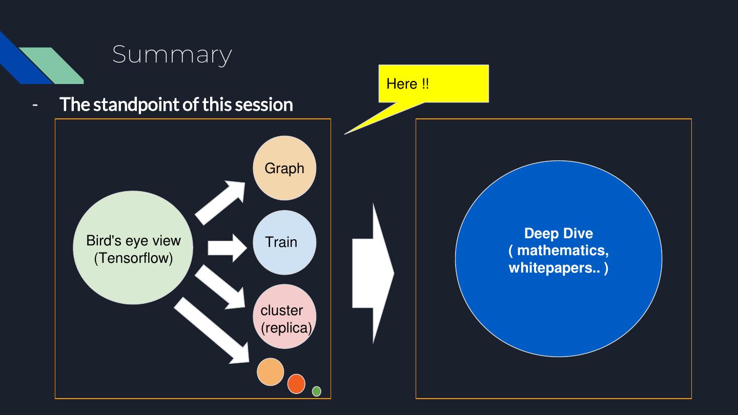 3 . Summary Here !! - The standpoint of this session Graph Deep Dive Bird's eye view Train ( mathematics, (Tensorflow) whitepapers.. ) cluster (replica)