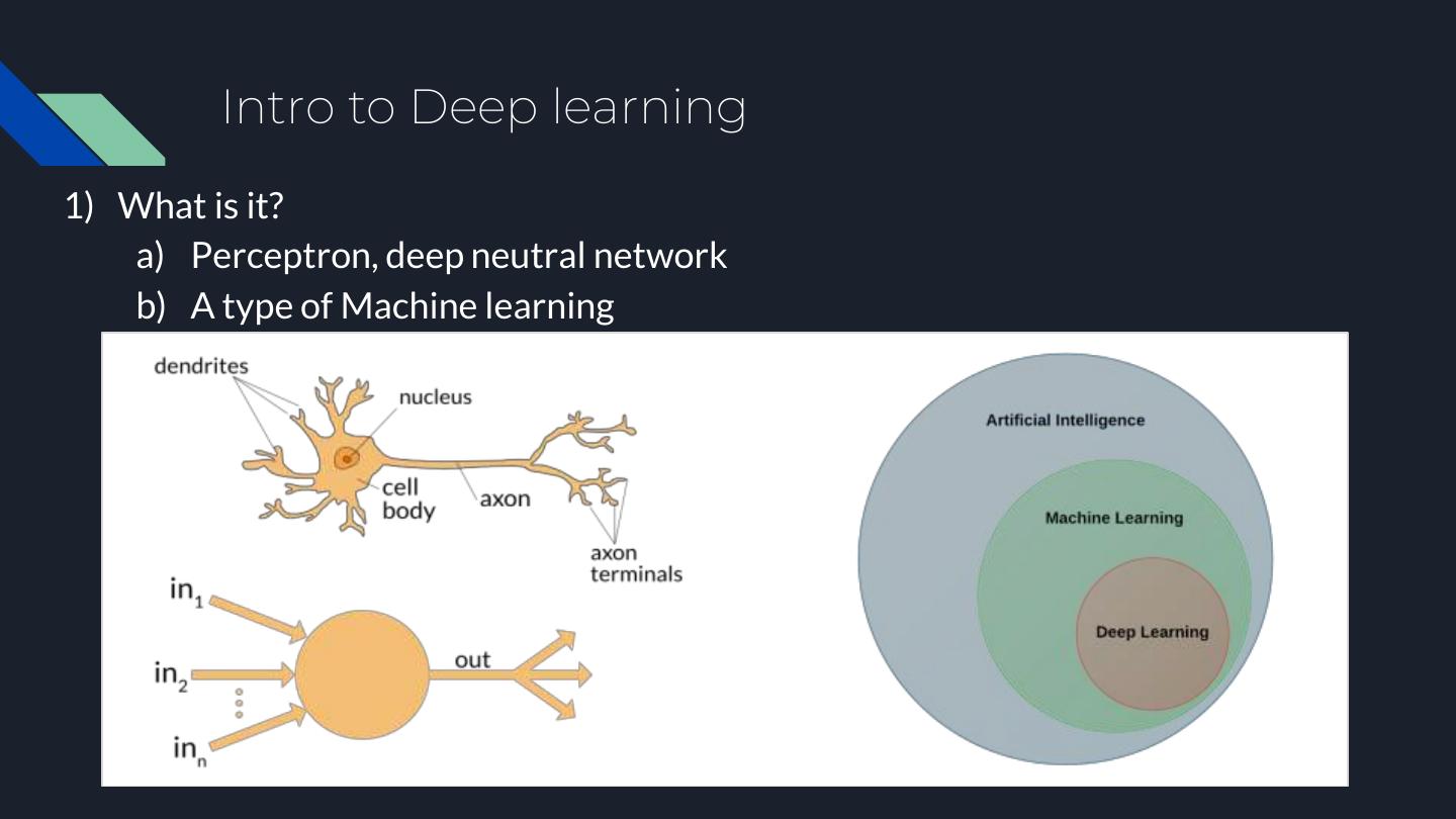 5 . Intro to Deep learning 1) What is it? a) Perceptron, deep neutral network b) A type of Machine learning