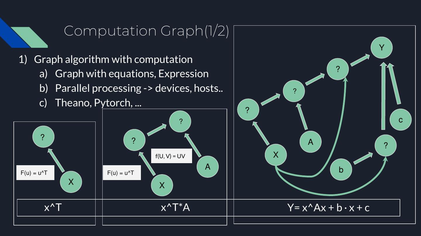 8 . Computation Graph(1/2) Y 1) Graph algorithm with computation ? a) Graph with equations, Expression b) Parallel processing -> devices, hosts.. ? c) Theano, Pytorch, ... ? ? c ? ? A ? f(U, V) = UV X A b F(u) = u^T F(u) = u^T X X x^T x^T*A Y= x^Ax + b · x + c