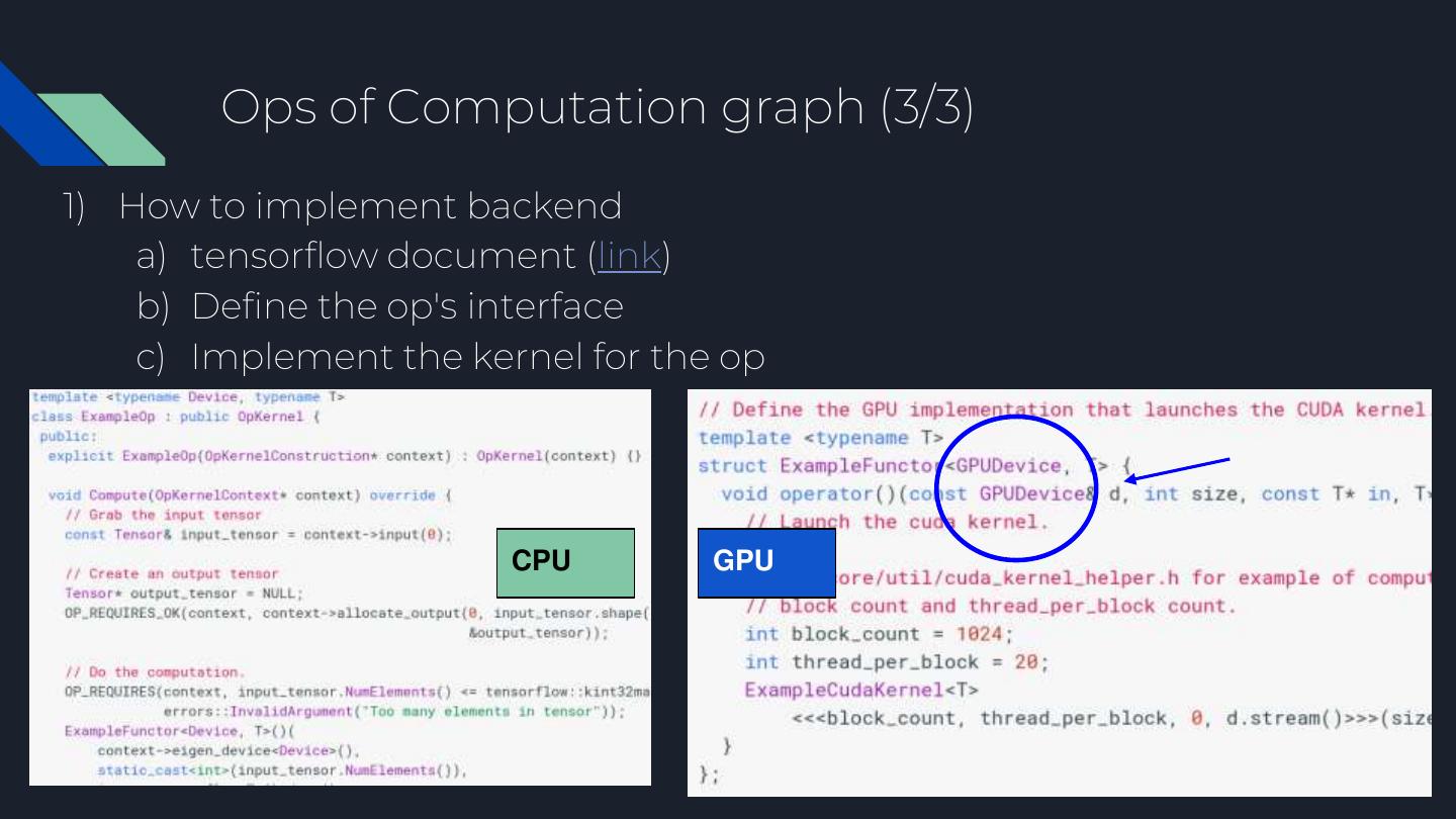 12 . Ops of Computation graph (3/3) 1) How to implement backend a) tensorflow document (link) b) Define the op's interface c) Implement the kernel for the op CPU GPU