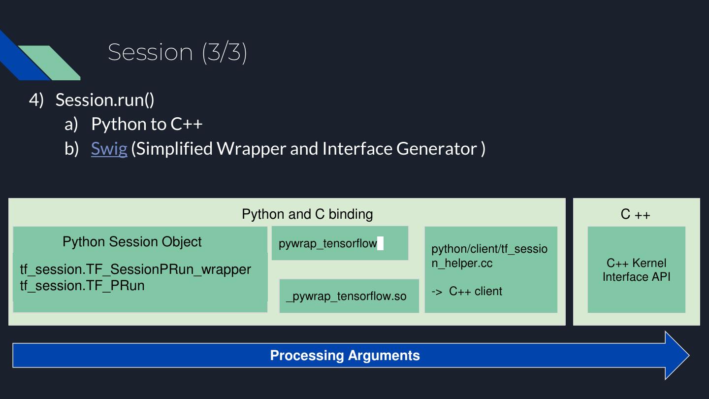 17 . Session (3/3) 4) Session.run() a) Python to C++ b) Swig (Simplified Wrapper and Interface Generator ) Python and C binding C ++ Python Session Object pywrap_tensorflow python/client/tf_sessio n_helper.cc C++ Kernel tf_session.TF_SessionPRun_wrapper Interface API tf_session.TF_PRun -> C++ client _pywrap_tensorflow.so Processing Arguments