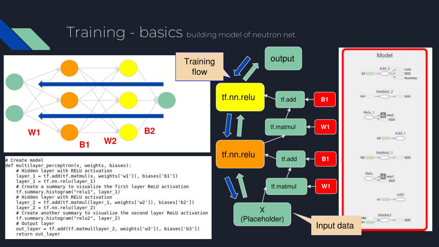 20 . Training - basics building model of neutron net Training output flow tf.nn.relu tf.add B1 tf.matmul W1 W1 B2 B1 W2 tf.nn.relu tf.add B1 tf.matmul W1 X (Placeholder) Input data