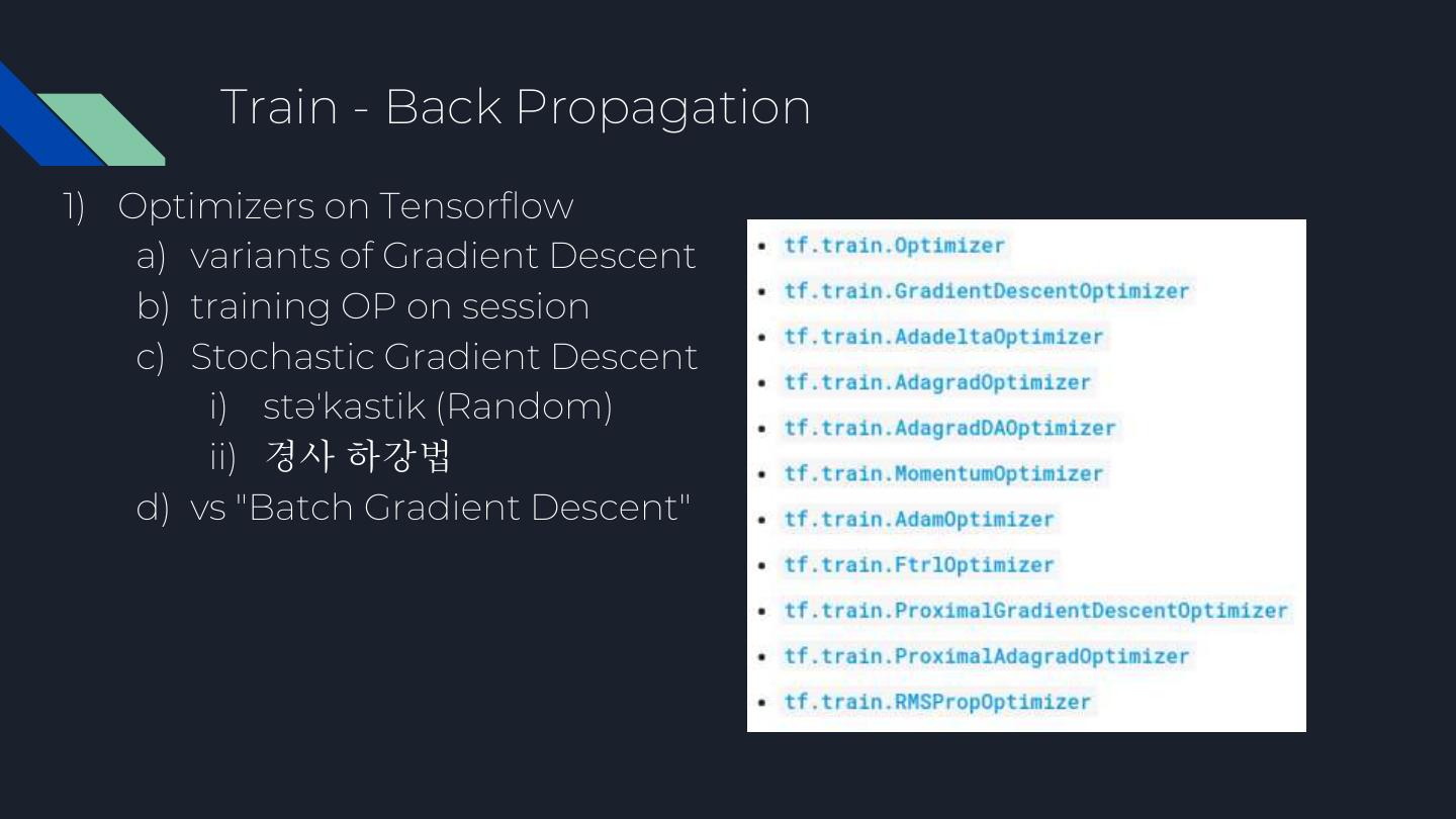 24 . Train - Back Propagation 1) Optimizers on Tensorflow a) variants of Gradient Descent b) training OP on session c) Stochastic Gradient Descent i) stəˈkastik (Random) ii) 경사 하강법 d) vs "Batch Gradient Descent"