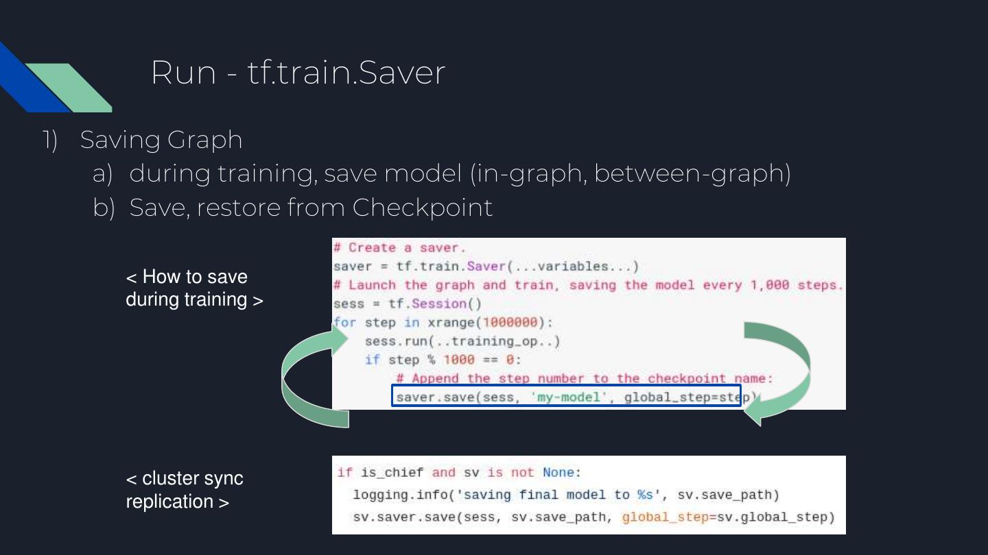 26 . Run - tf.train.Saver 1) Saving Graph a) during training, save model (in-graph, between-graph) b) Save, restore from Checkpoint < How to save during training > < cluster sync replication >