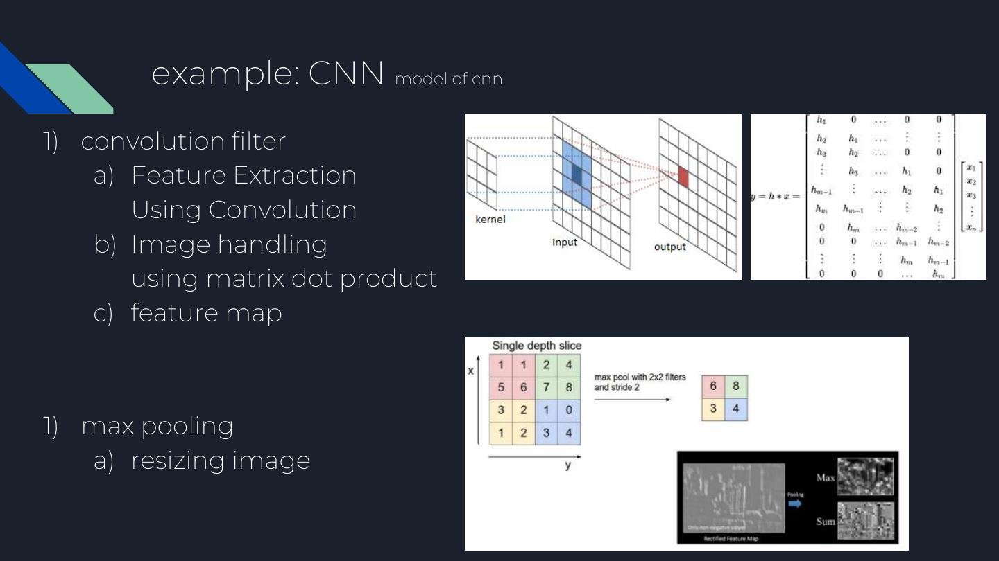 28 . example: CNN model of cnn 1) convolution filter a) Feature Extraction Using Convolution b) Image handling using matrix dot product c) feature map 1) max pooling a) resizing image
