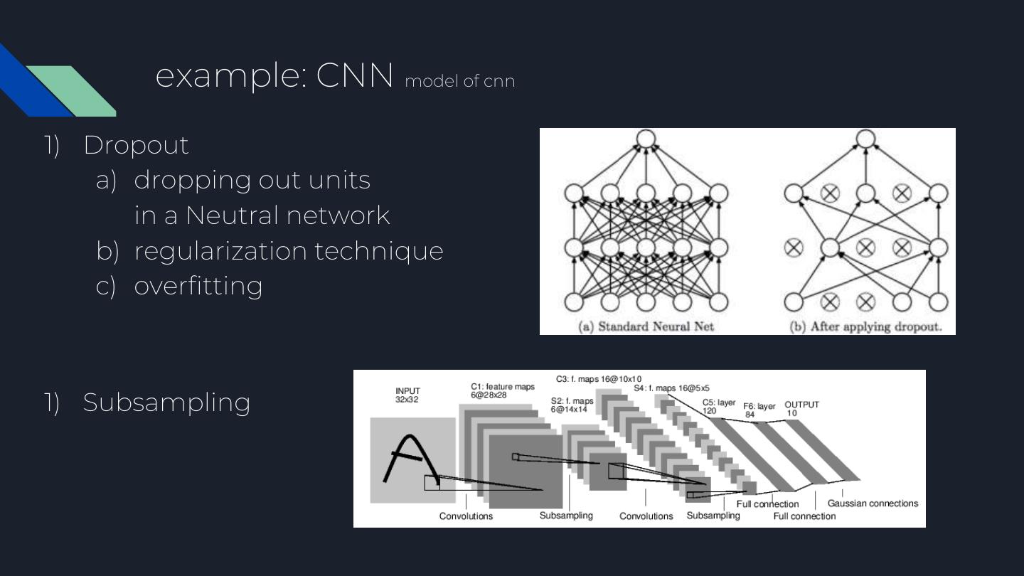 29 . example: CNN model of cnn 1) Dropout a) dropping out units in a Neutral network b) regularization technique c) overfitting 1) Subsampling