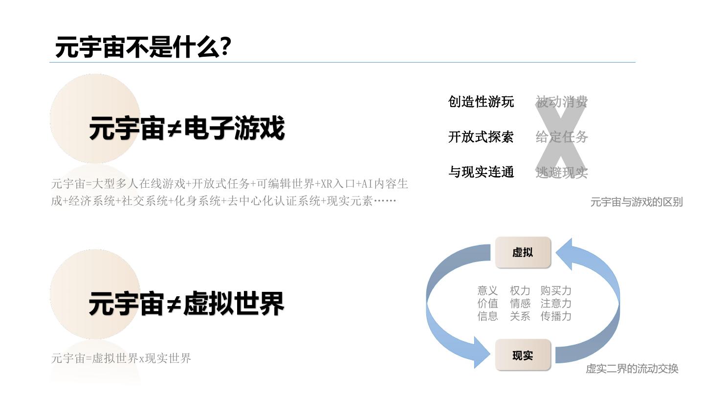15 .元宇宙不是什么? 创造性游玩 被动消费 开放式探索 给定任务 与现实连通 逃避现实 元宇宙=大型多人在线游戏+开放式任务+可编辑世界+XR入口+AI内容生 成+经济系统+社交系统+化身系统+去中心化认证系统+现实元素…… 元宇宙与游戏的区别 元宇宙=虚拟世界x现实世界 虚实二界的流动交换