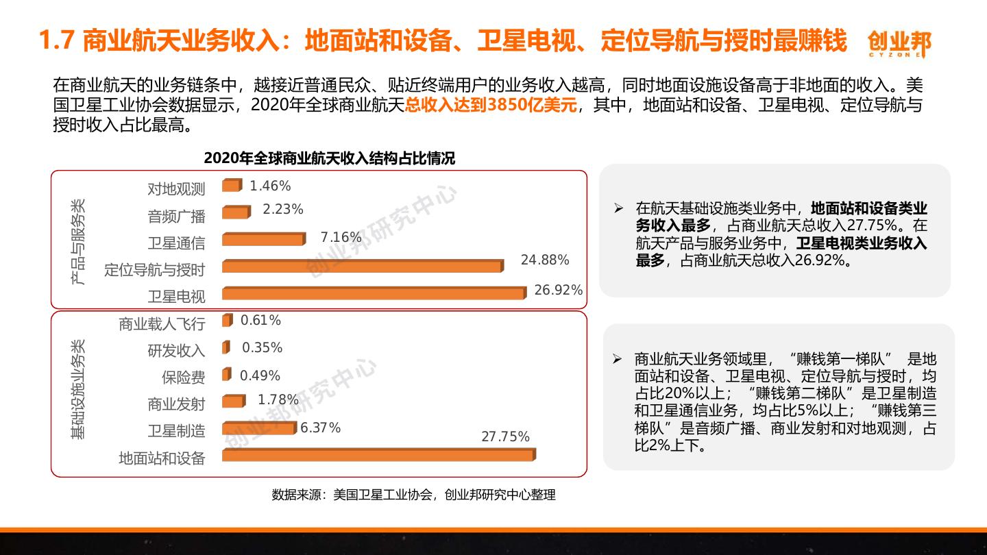 10 .1.7 商业航天业务收入:地面站和设备、卫星电视、定位导航与授时最赚钱 在商业航天的业务链条中,越接近普通民众、贴近终端用户的业务收入越高,同时地面设施设备高于非地面的收入。美 国卫星工业协会数据显示,2020年全球商业航天总收入达到3850亿美元,其中,地面站和设备、卫星电视、定位导航与 授时收入占比最高。 2020年全球商业航天收入结构占比情况 对地观测 1.46% 在航天基础设施类业务中,地面站和设备类业 产品与服务类 音频广播 2.23% 务收入最多,占商业航天总收入27.75%。在 卫星通信 7.16% 航天产品与服务业务中,卫星电视类业务收入 24.88% 最多,占商业航天总收入26.92%。 定位导航与授时 卫星电视 26.92% 商业载人飞行 0.61% 基础设施业务类 研发收入 0.35% 商业航天业务领域里,“赚钱第一梯队” 是地 保险费 0.49% 面站和设备、卫星电视、定位导航与授时,均 1.78% 占比20%以上;“赚钱第二梯队”是卫星制造 商业发射 和卫星通信业务,均占比5%以上;“赚钱第三 卫星制造 6.37% 梯队”是音频广播、商业发射和对地观测,占 27.75% 比2%上下。 地面站和设备 数据来源:美国卫星工业协会,创业邦研究中心整理