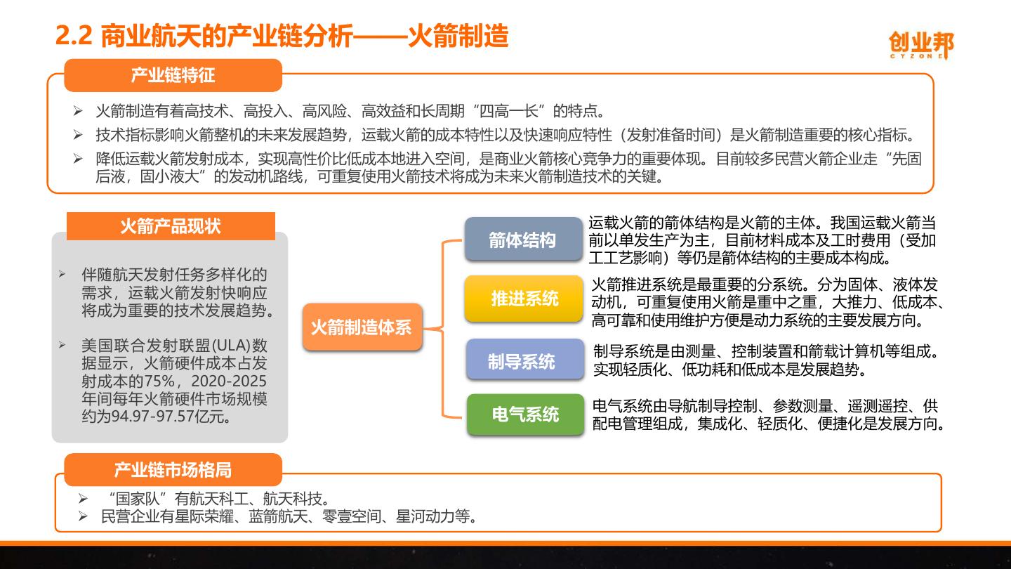 14 .2.2 商业航天的产业链分析——火箭制造 产业链特征 火箭制造有着高技术、高投入、高风险、高效益和长周期“四高一长”的特点。 技术指标影响火箭整机的未来发展趋势,运载火箭的成本特性以及快速响应特性(发射准备时间)是火箭制造重要的核心指标。 降低运载火箭发射成本,实现高性价比低成本地进入空间,是商业火箭核心竞争力的重要体现。目前较多民营火箭企业走“先固 后液,固小液大”的发动机路线,可重复使用火箭技术将成为未来火箭制造技术的关键。 火箭产品现状 运载火箭的箭体结构是火箭的主体。我国运载火箭当 箭体结构 前以单发生产为主,目前材料成本及工时费用(受加 工工艺影响)等仍是箭体结构的主要成本构成。 伴随航天发射任务多样化的 火箭推进系统是最重要的分系统。分为固体、液体发 需求,运载火箭发射快响应 推进系统 动机,可重复使用火箭是重中之重,大推力、低成本、 将成为重要的技术发展趋势。 高可靠和使用维护方便是动力系统的主要发展方向。 火箭制造体系 美 国联 合发射 联盟 (ULA) 数 制导系统是由测量、控制装置和箭载计算机等组成。 据显示,火箭硬件成本占发 制导系统 实现轻质化、低功耗和低成本是发展趋势。 射成本的75%,2020-2025 年间每年火箭硬件市场规模 电气系统由导航制导控制、参数测量、遥测遥控、供 约为94.97-97.57亿元。 电气系统 配电管理组成,集成化、轻质化、便捷化是发展方向。 产业链市场格局 “国家队”有航天科工、航天科技。 民营企业有星际荣耀、蓝箭航天、零壹空间、星河动力等。