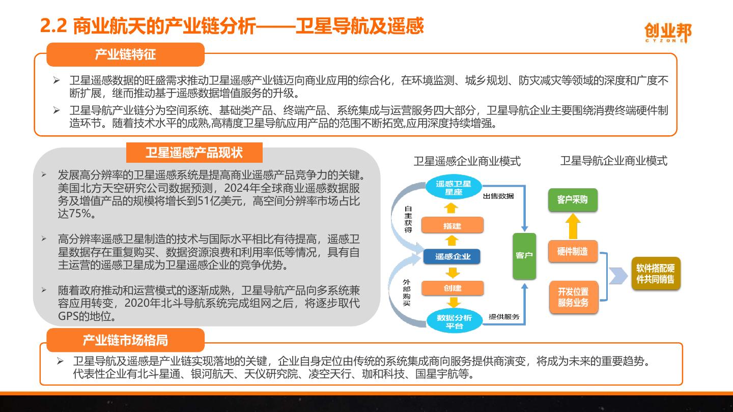16 .2.2 商业航天的产业链分析——卫星导航及遥感 产业链特征 卫星遥感数据的旺盛需求推动卫星遥感产业链迈向商业应用的综合化,在环境监测、城乡规划、防灾减灾等领域的深度和广度不 断扩展,继而推动基于遥感数据增值服务的升级。 卫星导航产业链分为空间系统、基础类产品、终端产品、系统集成与运营服务四大部分,卫星导航企业主要围绕消费终端硬件制 造环节。随着技术水平的成熟,高精度卫星导航应用产品的范围不断拓宽,应用深度持续增强。 卫星遥感产品现状 卫星遥感企业商业模式 卫星导航企业商业模式 发展高分辨率的卫星遥感系统是提高商业遥感产品竞争力的关键。 美国北方天空研究公司数据预测,2024年全球商业遥感数据服 务及增值产品的规模将增长到51亿美元,高空间分辨率市场占比 达75%。 高分辨率遥感卫星制造的技术与国际水平相比有待提高,遥感卫 星数据存在重复购买、数据资源浪费和利用率低等情况,具有自 主运营的遥感卫星成为卫星遥感企业的竞争优势。 随着政府推动和运营模式的逐渐成熟,卫星导航产品向多系统兼 容应用转变,2020年北斗导航系统完成组网之后,将逐步取代 GPS的地位。 产业链市场格局 卫星导航及遥感是产业链实现落地的关键,企业自身定位由传统的系统集成商向服务提供商演变,将成为未来的重要趋势。 代表性企业有北斗星通、银河航天、天仪研究院、凌空天行、珈和科技、国星宇航等。