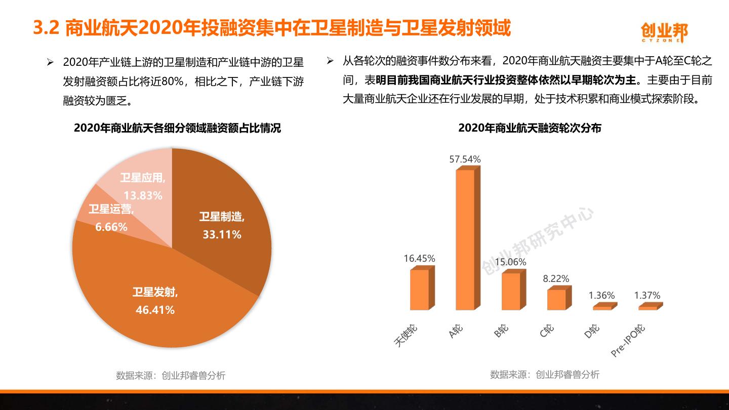 20 .3.2 商业航天2020年投融资集中在卫星制造与卫星发射领域 2020年产业链上游的卫星制造和产业链中游的卫星 从各轮次的融资事件数分布来看,2020年商业航天融资主要集中于A轮至C轮之 发射融资额占比将近80%,相比之下,产业链下游 间,表明目前我国商业航天行业投资整体依然以早期轮次为主。主要由于目前 融资较为匮乏。 大量商业航天企业还在行业发展的早期,处于技术积累和商业模式探索阶段。 2020年商业航天各细分领域融资额占比情况 2020年商业航天融资轮次分布 57.54% 卫星应用, 13.83% 卫星运营, 卫星制造, 6.66% 33.11% 16.45% 15.06% 8.22% 卫星发射, 1.36% 1.37% 46.41% 数据来源:创业邦睿兽分析 数据来源:创业邦睿兽分析