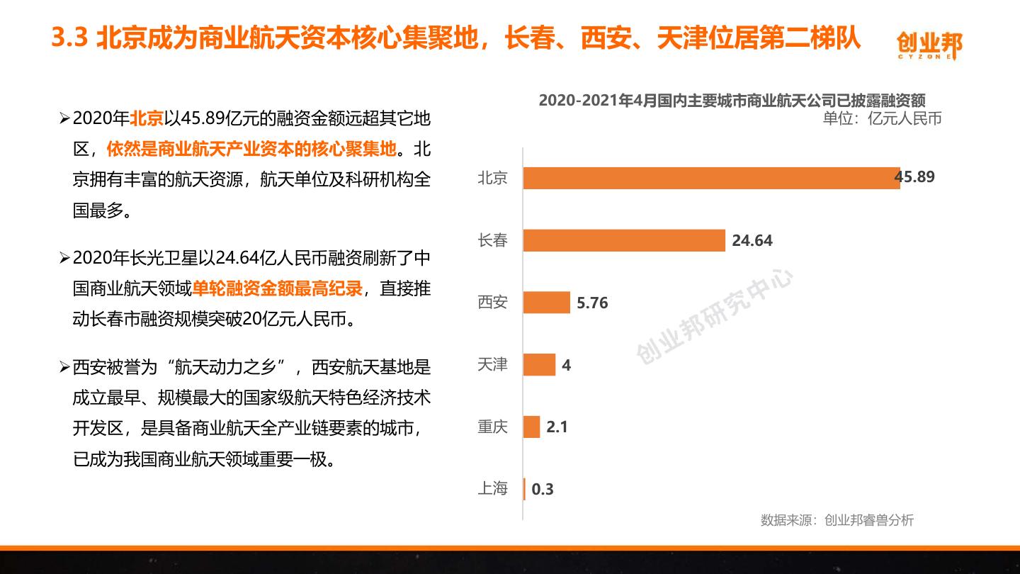 21 .3.3 北京成为商业航天资本核心集聚地,长春、西安、天津位居第二梯队 2020-2021年4月国内主要城市商业航天公司已披露融资额 2020年北京以45.89亿元的融资金额远超其它地 单位:亿元人民币 区,依然是商业航天产业资本的核心聚集地。北 京拥有丰富的航天资源,航天单位及科研机构全 北京 45.89 国最多。 长春 24.64 2020年长光卫星以24.64亿人民币融资刷新了中 国商业航天领域单轮融资金额最高纪录,直接推 西安 5.76 动长春市融资规模突破20亿元人民币。 西安被誉为“航天动力之乡”,西安航天基地是 天津 4 成立最早、规模最大的国家级航天特色经济技术 开发区,是具备商业航天全产业链要素的城市, 重庆 2.1 已成为我国商业航天领域重要一极。 上海 0.3 数据来源:创业邦睿兽分析