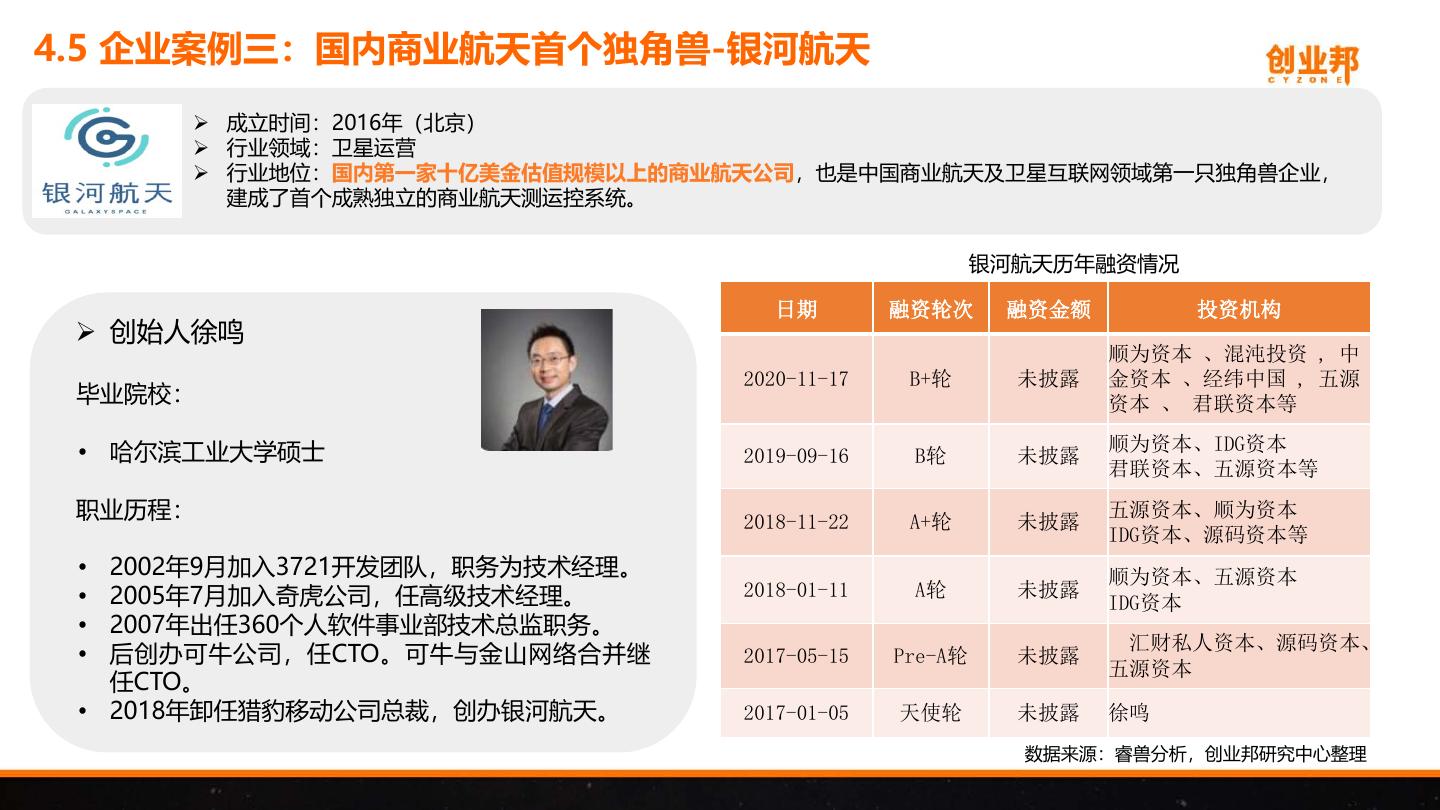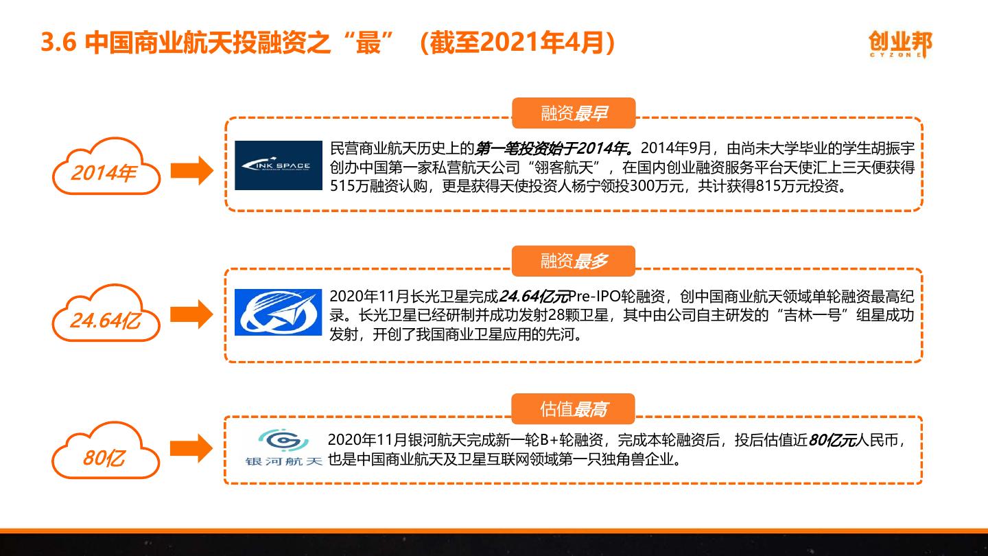 24 .3.6 中国商业航天投融资之“最”(截至2021年4月) 融资最早 民营商业航天历史上的第一笔投资始于2014年。2014年9月,由尚未大学毕业的学生胡振宇 2014年 创办中国第一家私营航天公司“翎客航天”,在国内创业融资服务平台天使汇上三天便获得 515万融资认购,更是获得天使投资人杨宁领投300万元,共计获得815万元投资。 融资最多 2020年11月长光卫星完成24.64亿元Pre-IPO轮融资,创中国商业航天领域单轮融资最高纪 24.64亿 录。长光卫星已经研制并成功发射28颗卫星,其中由公司自主研发的“吉林一号”组星成功 发射,开创了我国商业卫星应用的先河。 估值最高 2020年11月银河航天完成新一轮B+轮融资,完成本轮融资后,投后估值近80亿元人民币, 80亿 也是中国商业航天及卫星互联网领域第一只独角兽企业。