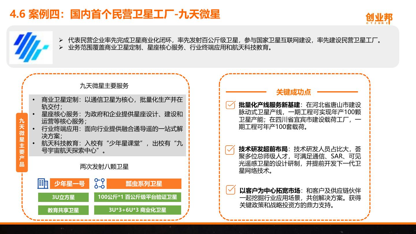 17 .2.3 中国商业航天企业图谱 卫星产业是商业航天经济的主要构成部分,商业火箭和卫星制造领域,正在逐步成型,成为我国航天产业的核心中坚力量。而商业载 人、深空探测、太空站等业务仍处于萌芽阶段,总体经济规模较小。 数据来源:创业邦睿兽分析 总体而言,背靠航天军工科研院所的“国家队”在发射资源、卫星技术积累以及工程能力等方面仍具有明显优势,大批民营初创航天 企业在民营资本的助力之下纷纷成立,由于民营的科研机构和相关企业受到的体制内束缚较少,在商业模式的创新、先进技术的应用 以及降本增效等方面占得先机,可以有效地与国家队形成互补。