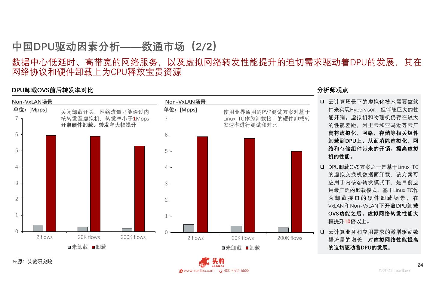 23 .中国DPU驱动因素分析——数通市场(1/2) DPU为应用需求驱动产物,其将网络、存储、操作系统中需要高性能的数据平面卸载到DPU以降低“数据 中心税”,让CPU集中精力于客户的应用程序 数据中心2-3年迭代,DPU市场周期性明显 分析师观点 数据中心带宽 网卡/DPU 需求 网卡仅负责数据链路传输,且传输速率要求相对较低 数据中心2-3年迭代一次,DPU 2012-2015年 10G/40G 10G及以下 网络层、传输层相关协议由CPU处理。由于数据流量相 随数据中心带宽的升级而迭代。 对可控,CPU可担任多职 2020 年,头部云计算厂商买入 网卡仍仅负责数据链路的传输,但对数据传输速率要求 400G数据中心时代,对DPU的 增加 2015-2018年 100G 10G 需求为25G/40G。预计到2023年, 这个阶段主要使用英特尔提供的软件加速方案,帮助 数据中心将升级至800G,届时 CPU应对数据流量的增长 云计算厂商需要升级100G DPU。 数据流量持续增长,CPU算力不足以同时处理业务数据 数据中心带宽升级,出于成本与 以及网络传输协议。 2019-2022年 400G 25G/40G 算力需求考虑云计算厂商同时会 网卡开始具备帮助CPU卸载的功能,因此需要与处理器 在当年更换1/3的DPU。在随后2 异构,构成DPU 年里,算力需求持续增加,更换 2023年,数据中心有望升级至800G,DPU迎来第一轮的 老旧服务器(服务器的生命周期 置换 2023年 800G 100G 通常在4-5年)的性价比更高。 结合算力需求以及成本考虑,云计算厂商通常会升级1/3 硬件 来源:头豹研究院 23 www.leadleo.com 400-072-5588 ©2021 LeadLeo