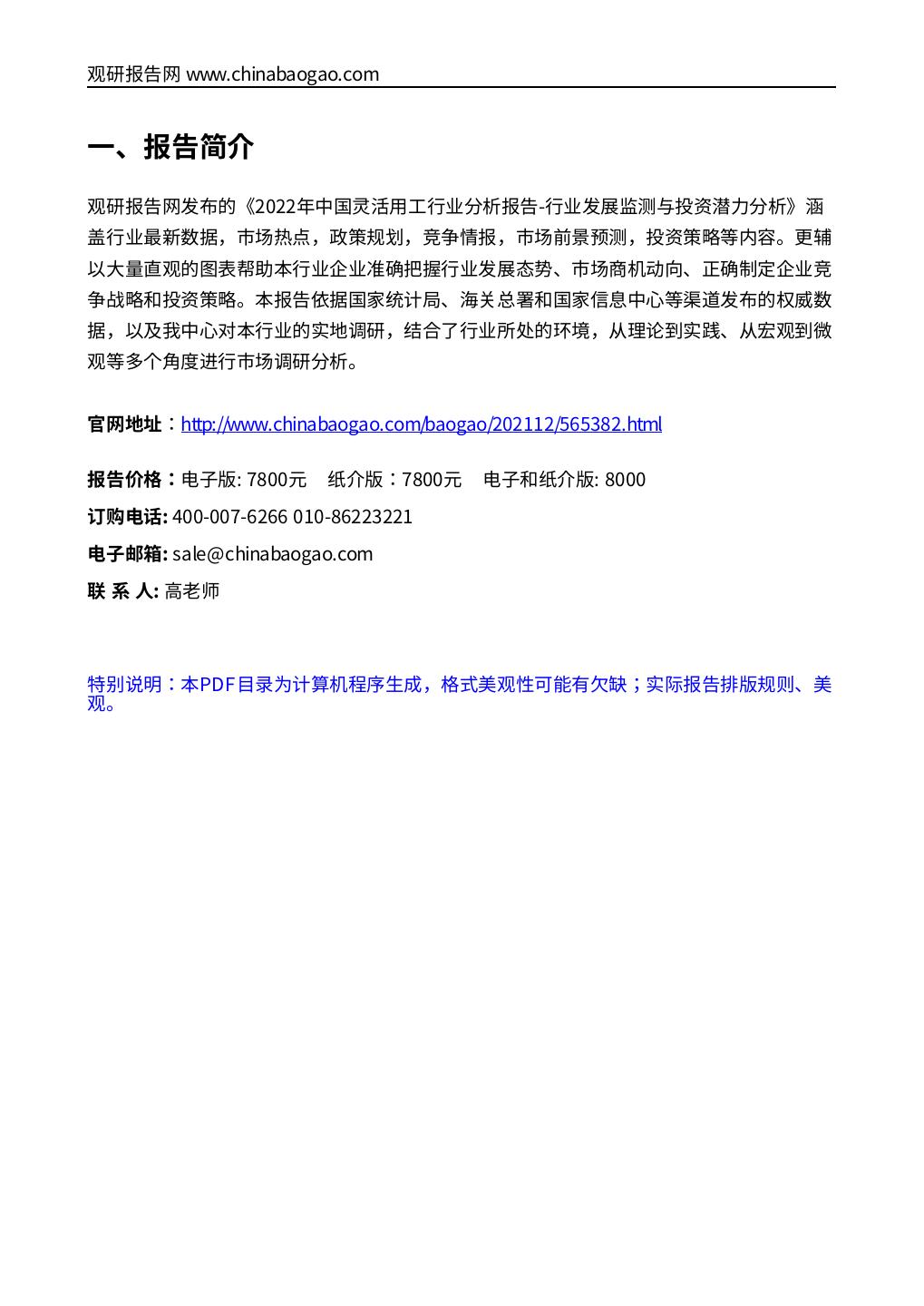2 .观研报告网 www.chinabaogao.com 一、报告简介 观研报告网发布的《2022年中国灵活用工行业分析报告-行业发展监测与投资潜力分析》涵 盖行业最新数据,市场热点,政策规划,竞争情报,市场前景预测,投资策略等内容。更辅 以大量直观的图表帮助本行业企业准确把握行业发展态势、市场商机动向、正确制定企业竞 争战略和投资策略。本报告依据国家统计局、海关总署和国家信息中心等渠道发布的权威数 据,以及我中心对本行业的实地调研,结合了行业所处的环境,从理论到实践、从宏观到微 观等多个角度进行市场调研分析。 官网地址:http://www.chinabaogao.com/baogao/202112/565382.html 报告价格:电子版: 7800元 纸介版:7800元 电子和纸介版: 8000 订购电话: 400-007-6266 010-86223221 电子邮箱: sale@chinabaogao.com 联 系 人: 高老师 特别说明:本PDF目录为计算机程序生成,格式美观性可能有欠缺;实际报告排版规则、美 观。