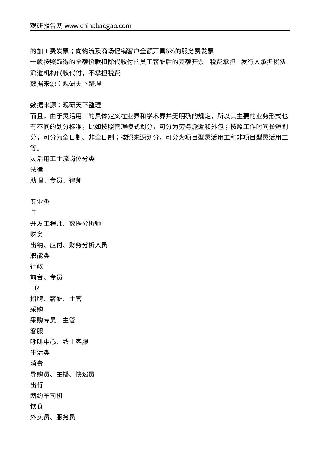 4 .观研报告网 www.chinabaogao.com 的加工费发票;向物流及商场促销客户全额开具6%的服务费发票 一般按照取得的全额价款扣除代收付的员工薪酬后的差额开票 税费承担 发行人承担税费 派遣机构代收代付,不承担税费 数据来源:观研天下整理 数据来源:观研天下整理 而且,由于灵活用工的具体定义在业界和学术界并无明确的规定,所以其主要的业务形式也 有不同的划分标准,比如按照管理模式划分,可分为劳务派遣和外包;按照工作时间长短划 分,可分为全日制、非全日制;按照来源划分,可分为项目型灵活用工和非项目型灵活用工 等。 灵活用工主流岗位分类 法律 助理、专员、律师 专业类 IT 开发工程师、数据分析师 财务 出纳、应付、财务分析人员 职能类 行政 前台、专员 HR 招聘、薪酬、主管 采购 采购专员、主管 客服 呼叫中心、线上客服 生活类 消费 导购员、主播、快递员 出行 网约车司机 饮食 外卖员、服务员