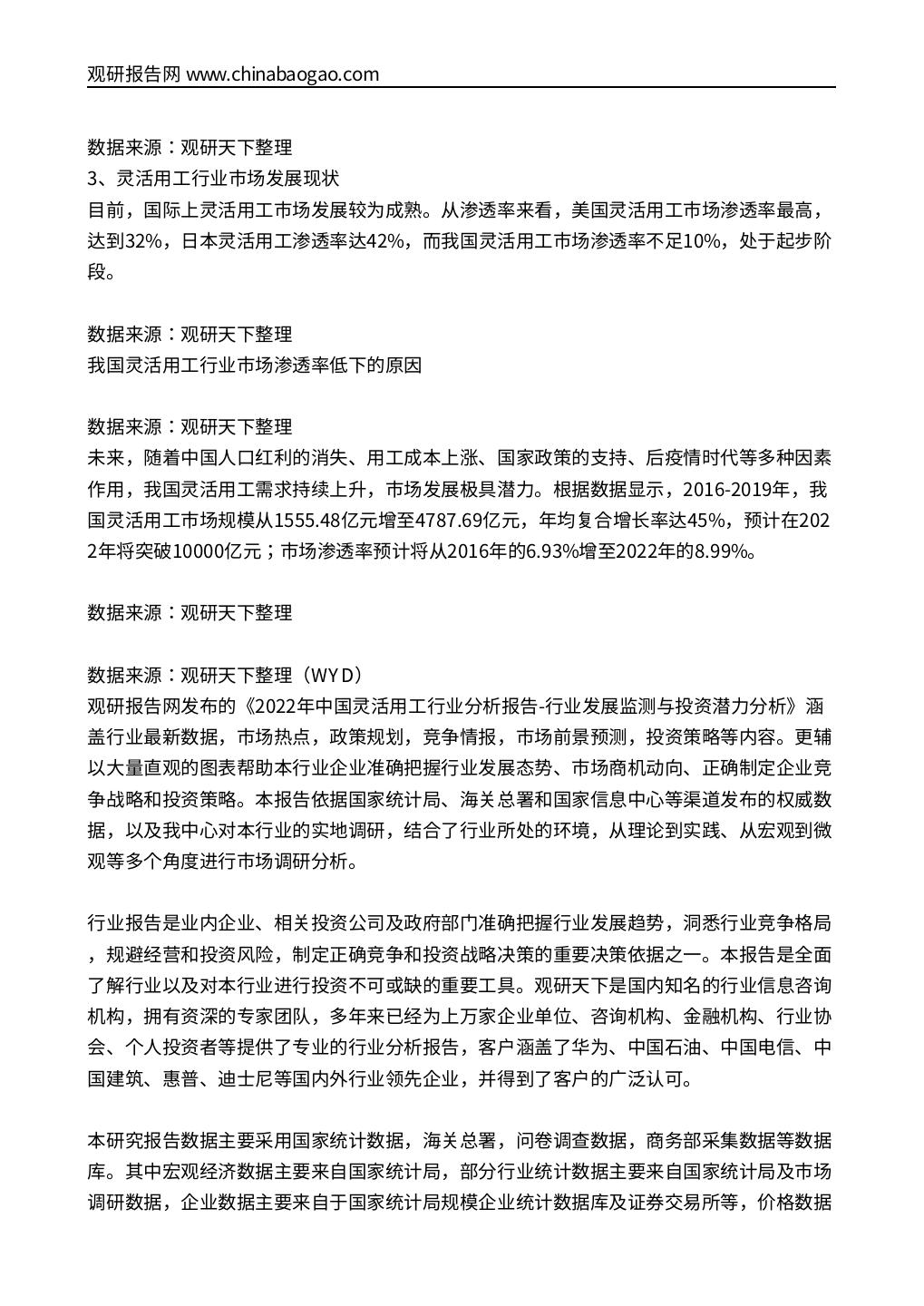 6 .观研报告网 www.chinabaogao.com 数据来源:观研天下整理 3、灵活用工行业市场发展现状 目前,国际上灵活用工市场发展较为成熟。从渗透率来看,美国灵活用工市场渗透率最高, 达到32%,日本灵活用工渗透率达42%,而我国灵活用工市场渗透率不足10%,处于起步阶 段。 数据来源:观研天下整理 我国灵活用工行业市场渗透率低下的原因 数据来源:观研天下整理 未来,随着中国人口红利的消失、用工成本上涨、国家政策的支持、后疫情时代等多种因素 作用,我国灵活用工需求持续上升,市场发展极具潜力。根据数据显示,2016-2019年,我 国灵活用工市场规模从1555.48亿元增至4787.69亿元,年均复合增长率达45%,预计在202 2年将突破10000亿元;市场渗透率预计将从2016年的6.93%增至2022年的8.99%。 数据来源:观研天下整理 数据来源:观研天下整理(WYD) 观研报告网发布的《2022年中国灵活用工行业分析报告-行业发展监测与投资潜力分析》涵 盖行业最新数据,市场热点,政策规划,竞争情报,市场前景预测,投资策略等内容。更辅 以大量直观的图表帮助本行业企业准确把握行业发展态势、市场商机动向、正确制定企业竞 争战略和投资策略。本报告依据国家统计局、海关总署和国家信息中心等渠道发布的权威数 据,以及我中心对本行业的实地调研,结合了行业所处的环境,从理论到实践、从宏观到微 观等多个角度进行市场调研分析。 行业报告是业内企业、相关投资公司及政府部门准确把握行业发展趋势,洞悉行业竞争格局 ,规避经营和投资风险,制定正确竞争和投资战略决策的重要决策依据之一。本报告是全面 了解行业以及对本行业进行投资不可或缺的重要工具。观研天下是国内知名的行业信息咨询 机构,拥有资深的专家团队,多年来已经为上万家企业单位、咨询机构、金融机构、行业协 会、个人投资者等提供了专业的行业分析报告,客户涵盖了华为、中国石油、中国电信、中 国建筑、惠普、迪士尼等国内外行业领先企业,并得到了客户的广泛认可。 本研究报告数据主要采用国家统计数据,海关总署,问卷调查数据,商务部采集数据等数据 库。其中宏观经济数据主要来自国家统计局,部分行业统计数据主要来自国家统计局及市场 调研数据,企业数据主要来自于国家统计局规模企业统计数据库及证券交易所等,价格数据