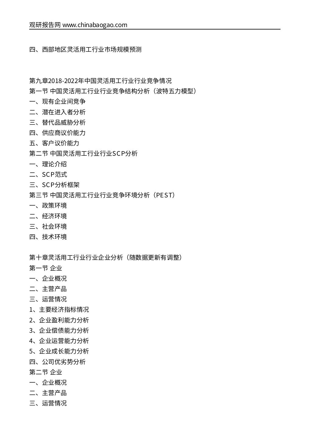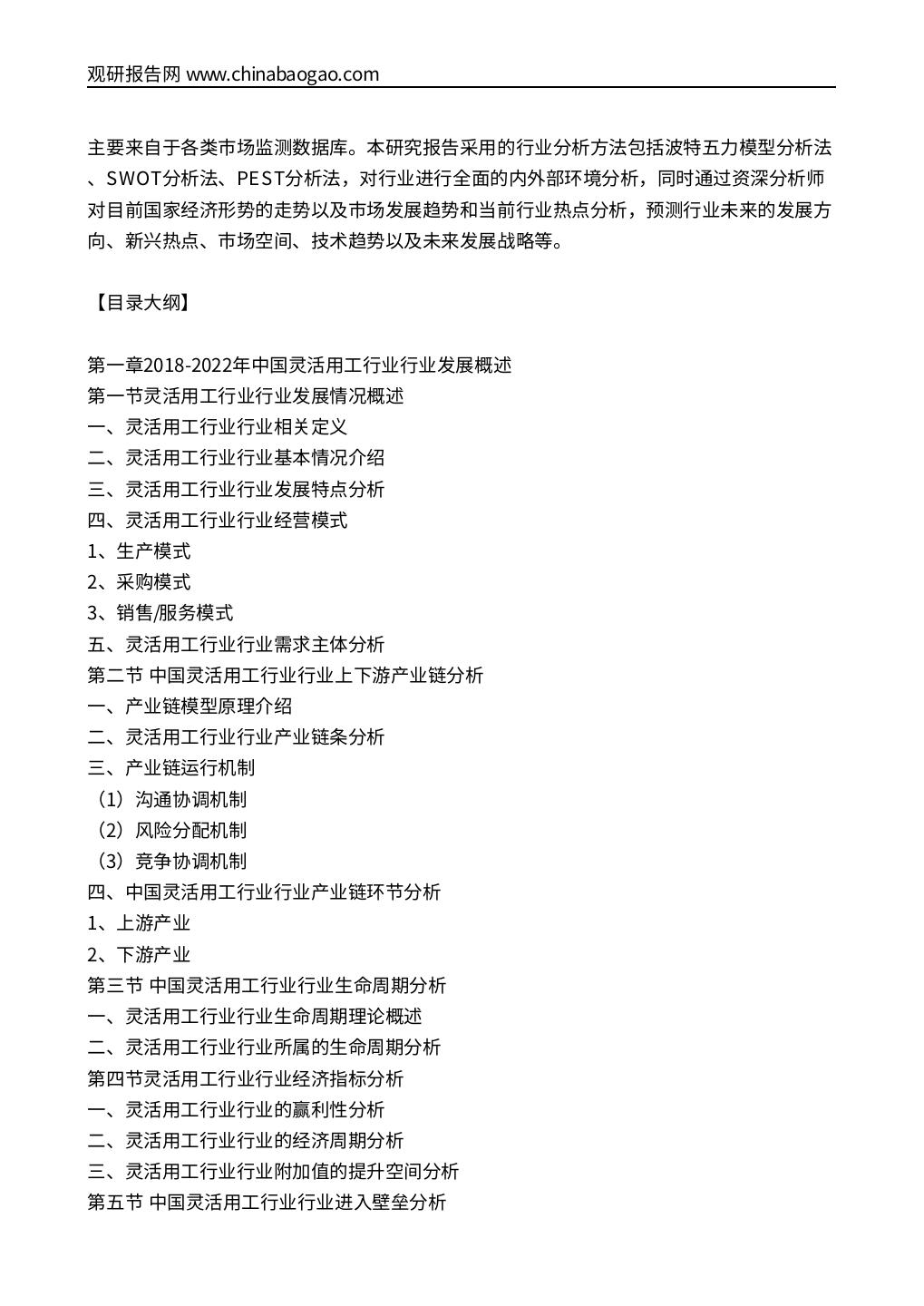 7 .观研报告网 www.chinabaogao.com 主要来自于各类市场监测数据库。本研究报告采用的行业分析方法包括波特五力模型分析法 、SWOT分析法、PEST分析法,对行业进行全面的内外部环境分析,同时通过资深分析师 对目前国家经济形势的走势以及市场发展趋势和当前行业热点分析,预测行业未来的发展方 向、新兴热点、市场空间、技术趋势以及未来发展战略等。 【目录大纲】 第一章2018-2022年中国灵活用工行业行业发展概述 第一节灵活用工行业行业发展情况概述 一、灵活用工行业行业相关定义 二、灵活用工行业行业基本情况介绍 三、灵活用工行业行业发展特点分析 四、灵活用工行业行业经营模式 1、生产模式 2、采购模式 3、销售/服务模式 五、灵活用工行业行业需求主体分析 第二节 中国灵活用工行业行业上下游产业链分析 一、产业链模型原理介绍 二、灵活用工行业行业产业链条分析 三、产业链运行机制 (1)沟通协调机制 (2)风险分配机制 (3)竞争协调机制 四、中国灵活用工行业行业产业链环节分析 1、上游产业 2、下游产业 第三节 中国灵活用工行业行业生命周期分析 一、灵活用工行业行业生命周期理论概述 二、灵活用工行业行业所属的生命周期分析 第四节灵活用工行业行业经济指标分析 一、灵活用工行业行业的赢利性分析 二、灵活用工行业行业的经济周期分析 三、灵活用工行业行业附加值的提升空间分析 第五节 中国灵活用工行业行业进入壁垒分析