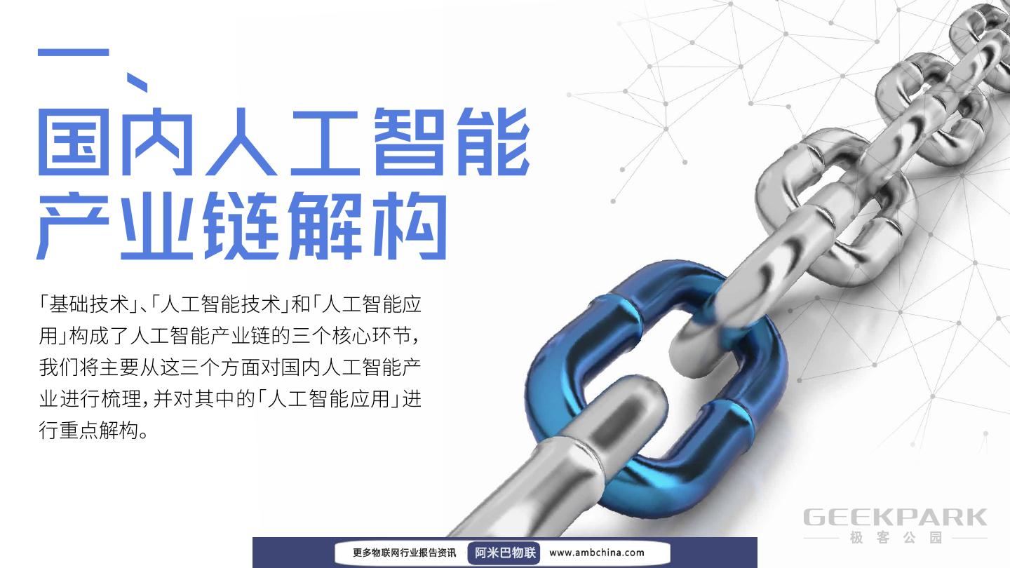 「基础技术」、「人工智能技术」和「人工智能应用」构成了人工智能产业链的三个核心环节。我们将主要从这三个方面对国内人工智能产业进行梳理,并对其中的「人工智能应用」进行重点解构。