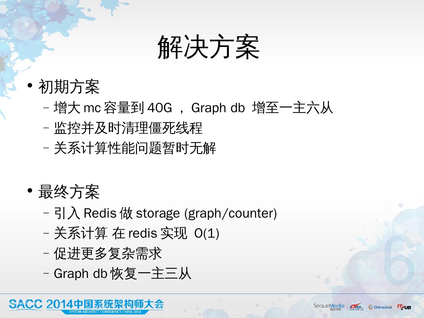 8 .解决方案 初期方案 增大 mc 容量到 4 0G,Graph db 增至 一主六从 监控并及时清理僵死线程 关系计算性能问题暂时无解 最终方案 引入 Redis 做 storage (graph/counter) 关系 计算 在redis实现 O(1) 促进更 多复杂需 求 Graph db 恢复一主三从