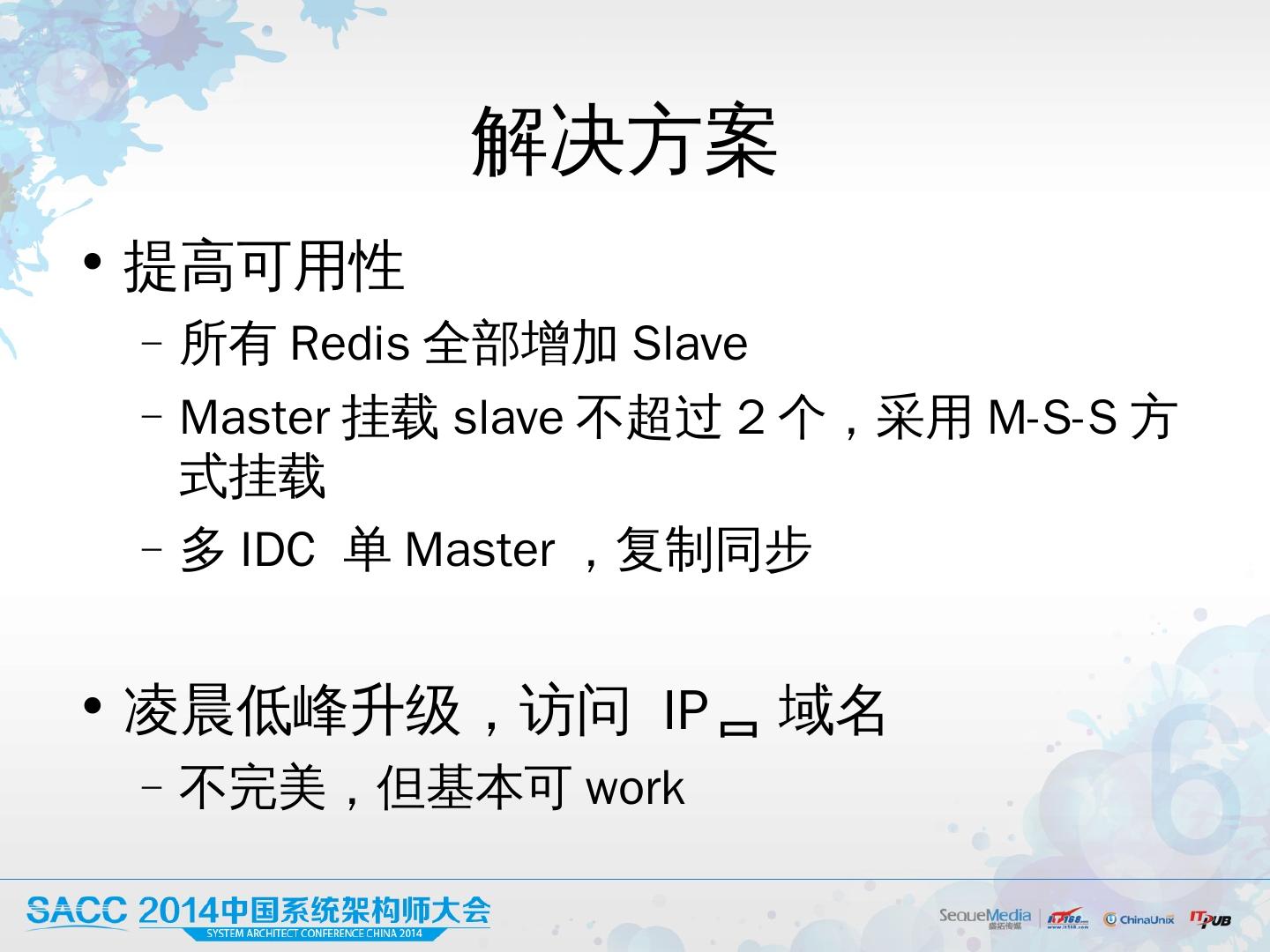 14 .解决方案 提高可用性 所有 Redis 全部增加 Slave Master 挂载 slave 不超过 2 个,采用 M-S-S 方式挂载 多 IDC 单 Master ,复制同步 凌晨低峰升级 ,访问 IP 域名 不完美, 但基本可 work