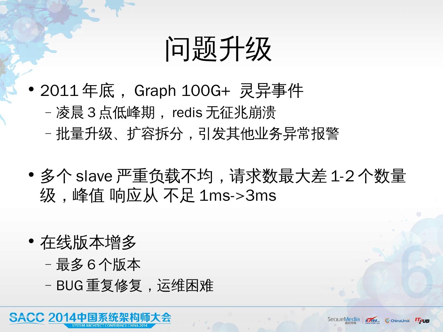 15 .问题 升级 2011 年底, Graph 1 00G + 灵异事件 凌晨 3 点低峰期, redis 无征兆崩 溃 批量升级、扩容拆分,引发其他业务异常报警 多个slave严重负载不均,请求数 最大 差1-2个数量级,峰值 响应从 不足1ms->3ms 在线版本增多 最多 6 个版本 BUG 重复修复, 运维困难