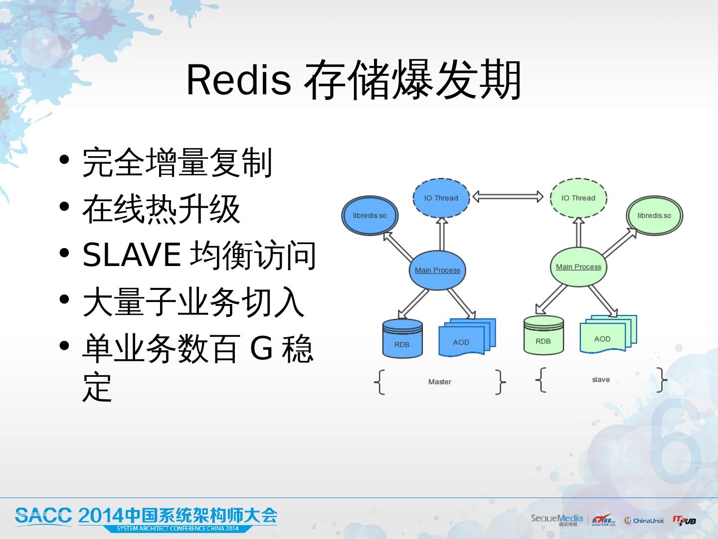 20 .Redis 存储爆发期 完全 增量复 制 在线热升级 SLAVE 均衡访问 大量子业务切入 单业务数百 G 稳定