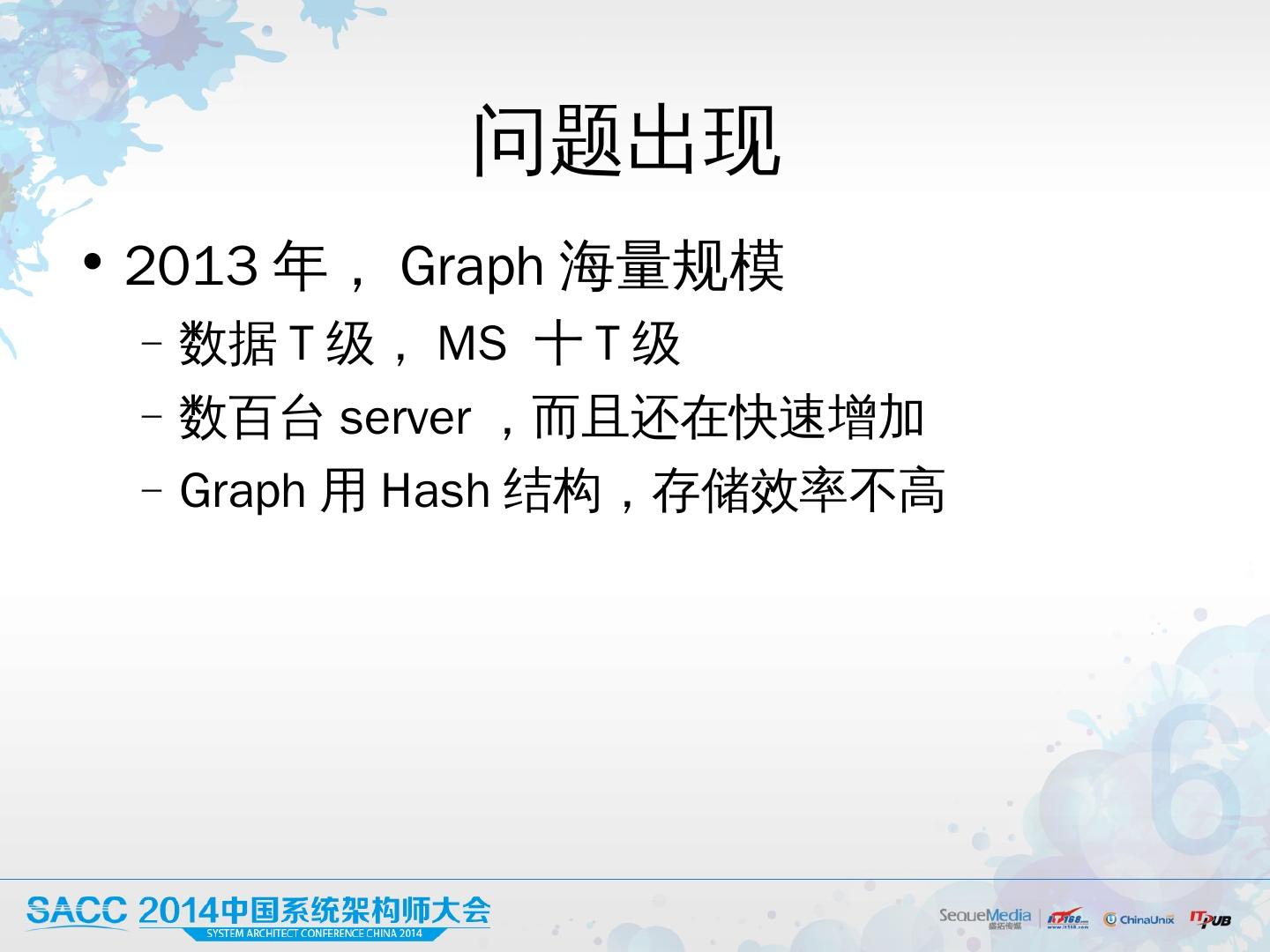 21 .问题出现 2013 年, Graph海量规模 数据T级,MS 十 T级 数百台server ,而且还在快速增加 Graph 用 Hash 结构,存储效率不高