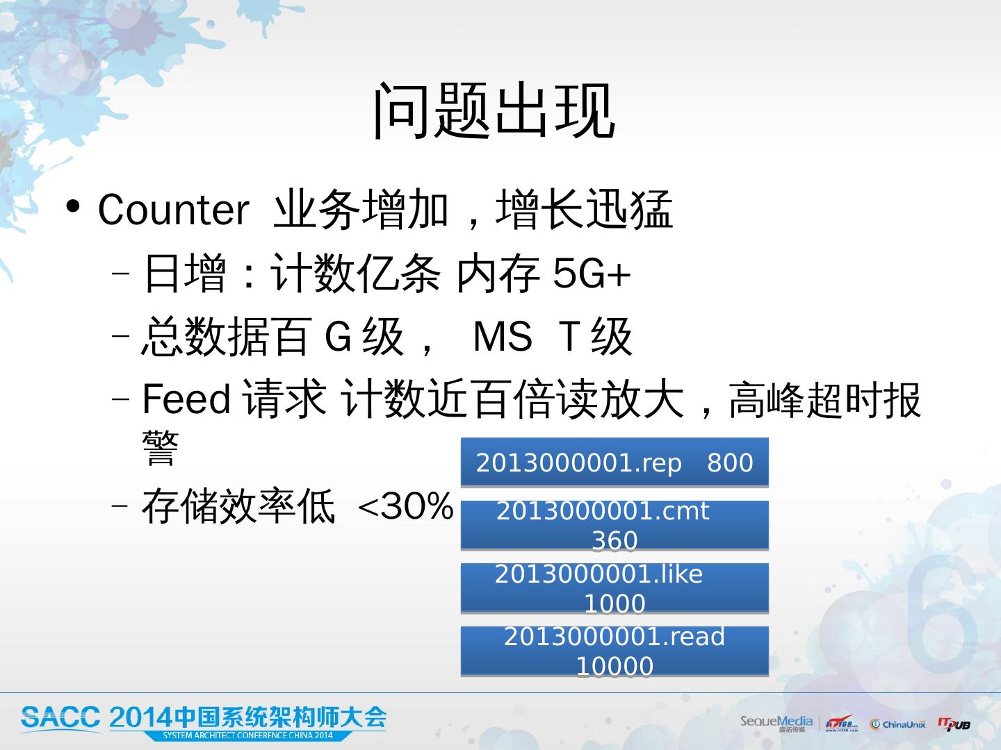 22 .问题出现 Counter 业务增加, 增长迅猛 日 增:计 数亿 条 内存 5G+ 总 数据百 G 级, MS T 级 Feed请求 计 数 近百倍 读 放大, 高 峰超时报警 存储效率低 <30% 2013000001.cmt 360 2013000001.like 1000 2013000001.rep 800 2013000001.read 10000