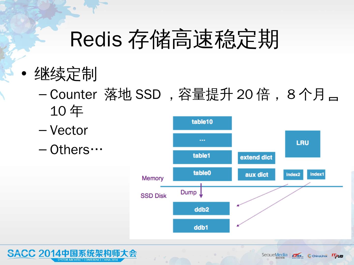 29 .Redis 存储高速稳定期 继续定制 Counter 落地 SSD , 容量提升 20 倍, 8 个月 10 年 Vector Others…