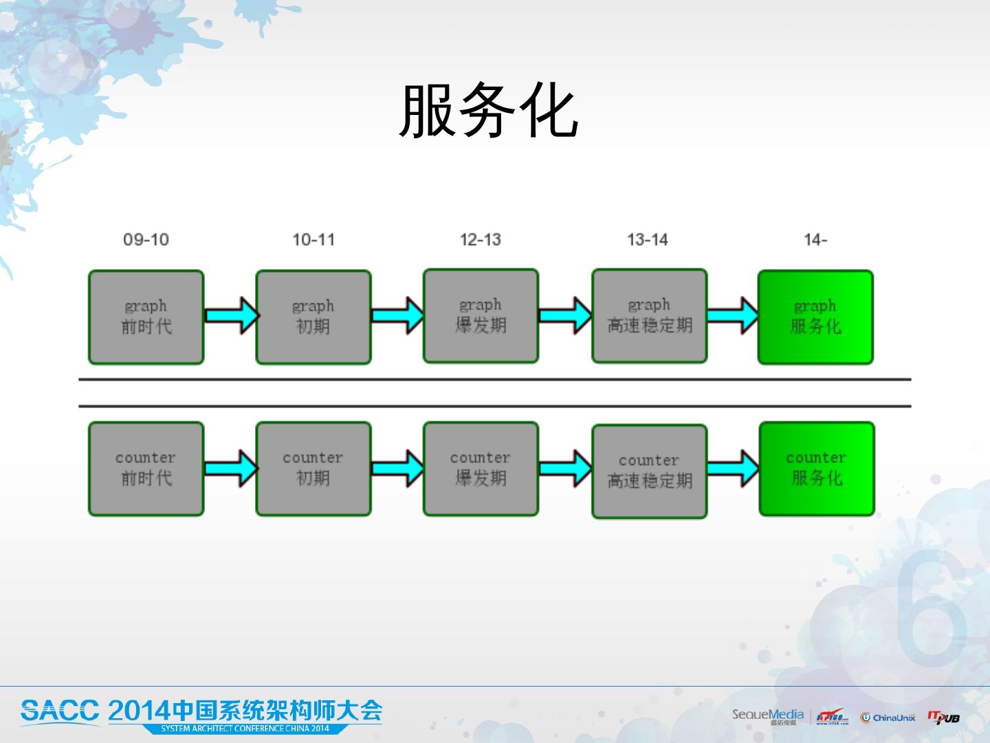 6 .Redis 前时代 热数据 mc 全量落地 mysql 数据量不大 : Graph mc 10G,计数器 mc 2G 开发速度