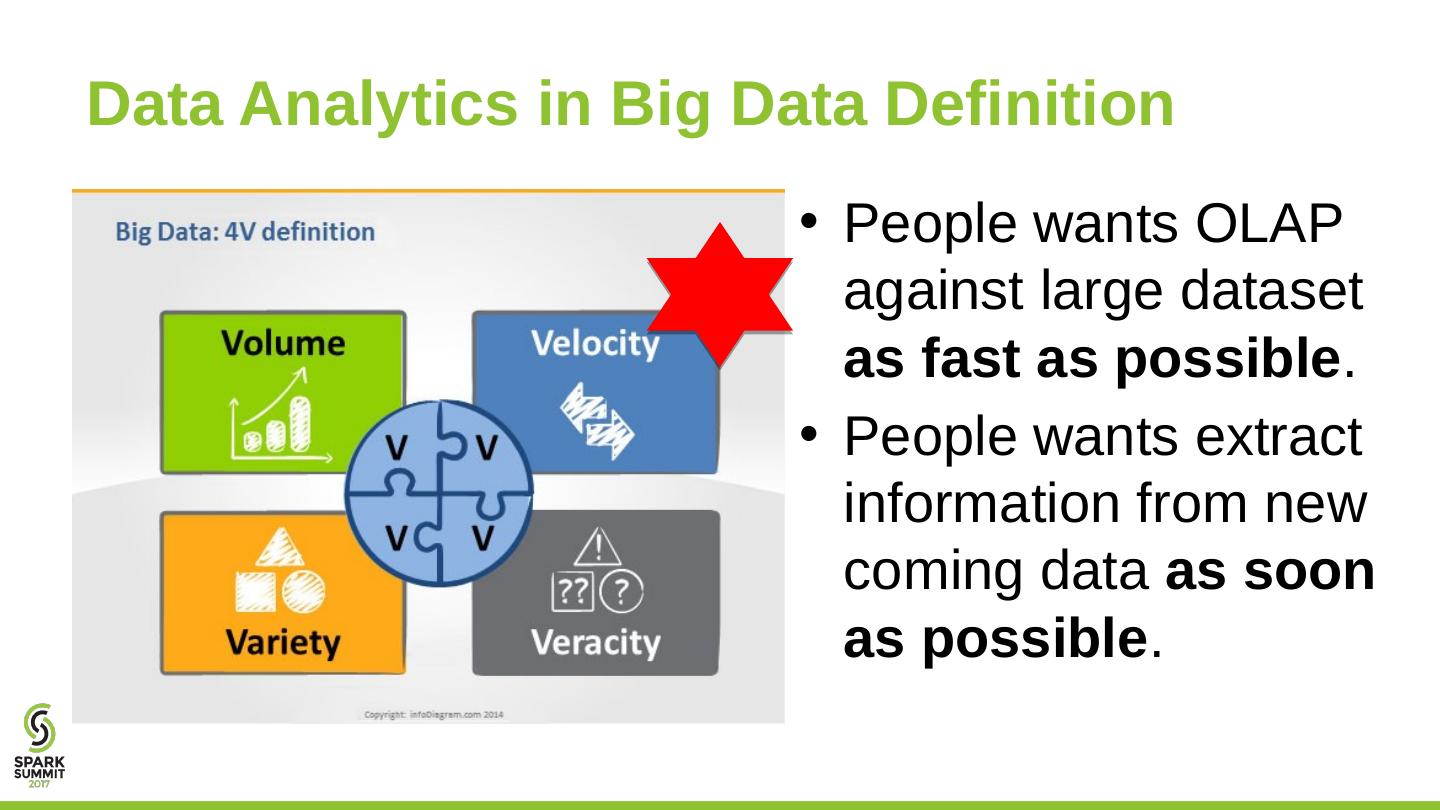 6 .Data Analytics in Big Data Definition People wants OLAP against large dataset as fast as possible . People wants extract information from new coming data as soon as possible .