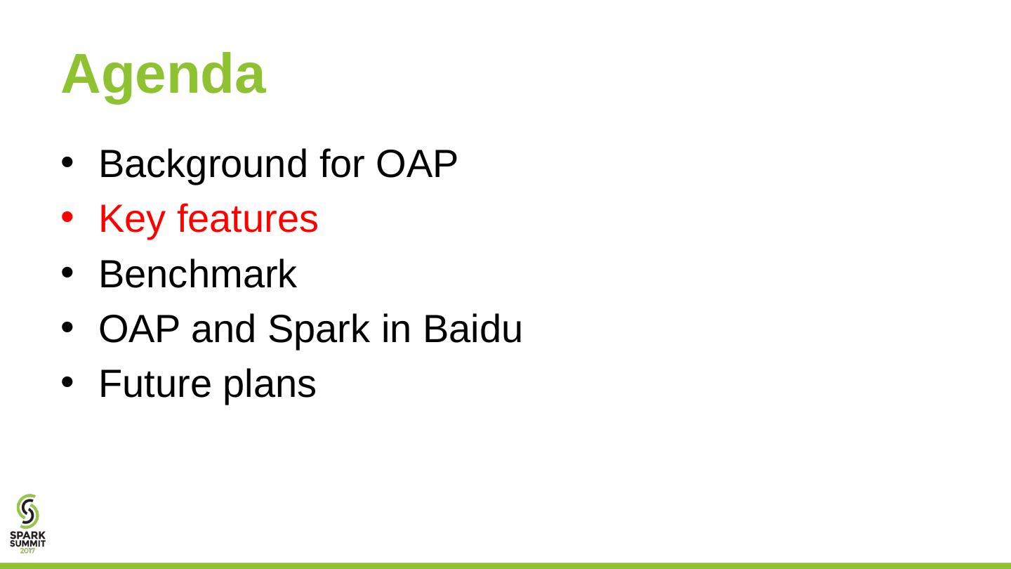 4 .Agenda Background for OAP Key features Benchmark OAP and Spark in Baidu Future plans