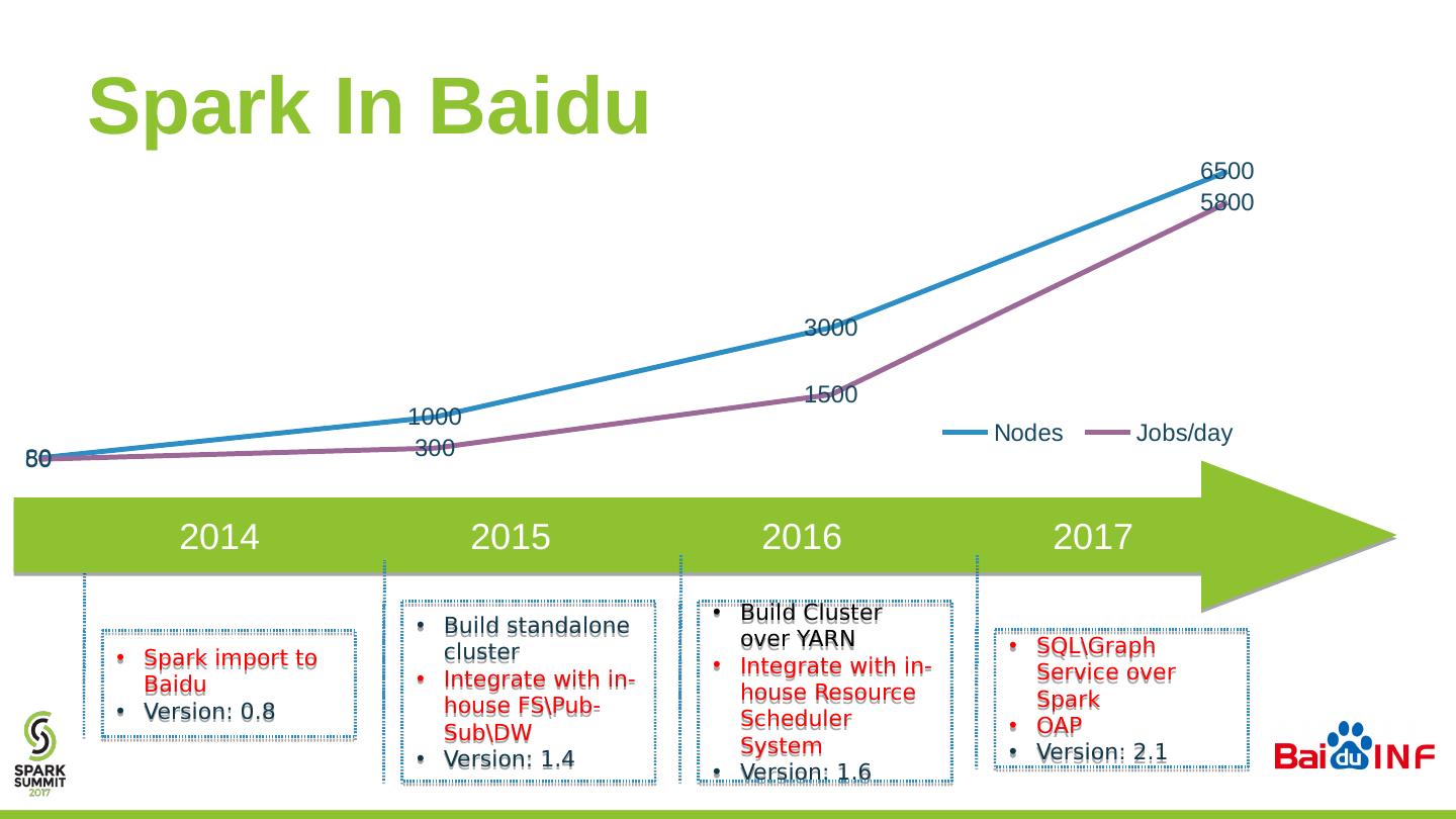 20 .Spark In Baidu Spark i mport to Baidu Version: 0.8 2014 2015 2016 2017 Build standalone c luster Integrate with in-house FS\Pub-Sub\DW Version: 1.4 Build Cluster over YARN Integrate with in-house Resource Scheduler System Version: 1.6 SQL\Graph Service over Spark OAP Version: 2.1