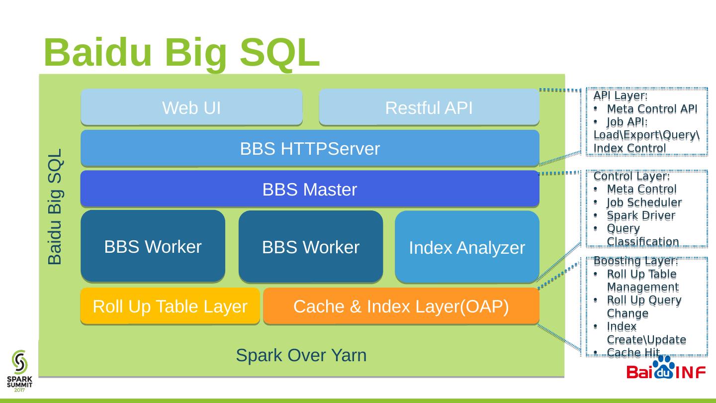21 .Baidu Big SQL Baidu Big SQL Web UI Restful API BBS HTTPServer BBS Worker BBS Worker Index Analyzer BBS Master Cache & Index Layer(OAP) Spark Over Yarn Roll Up Table Layer API Layer: Meta Control API Job API: Load\Export\Query\Index Control Control Layer: Meta Control Job Scheduler Spark Driver Query Classification Boosting Layer: Roll Up Table Management Roll Up Query Change Index Create\Update Cache Hit