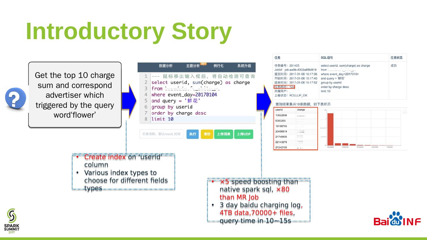 24 .Introductory Story Get the top 10 charge sum and correspond advertiser which triggered by the query word‘flower ’ Create index on ‘ userid ’ column Various index types to choose for different fields types ×5 speed boosting than native spark sql , ×80 than MR Job 3 day baidu charging log , 4TB data,70000+ files , query time in 10~15s