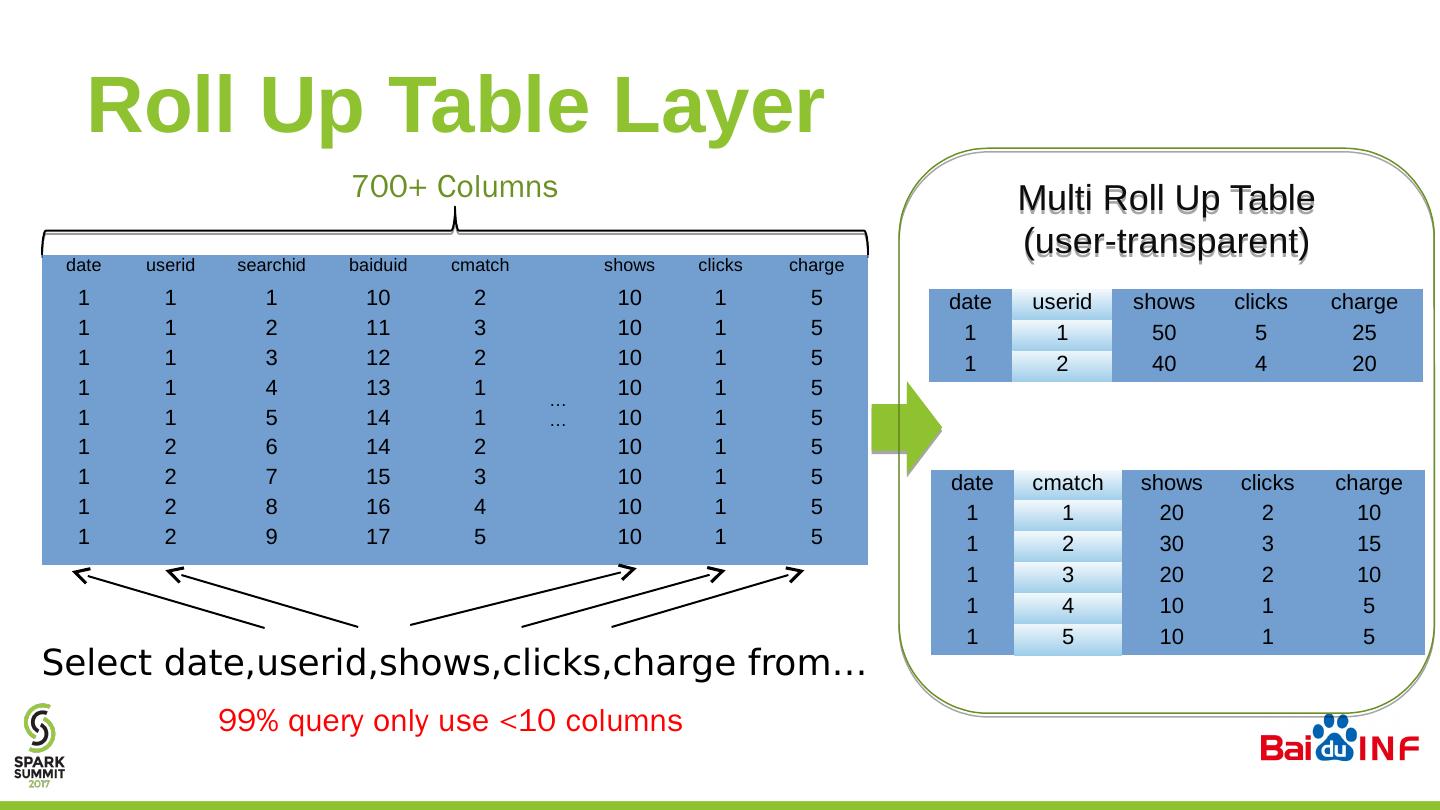 25 .Roll Up Table Layer date userid searchid b aiduid cmatch …… shows clicks charge 1 1 1 10 2 10 1 5 1 1 2 11 3 10 1 5 1 1 3 12 2 10 1 5 1 1 4 13 1 10 1 5 1 1 5 14 1 10 1 5 1 2 6 14 2 10 1 5 1 2 7 15 3 10 1 5 1 2 8 16 4 10 1 5 1 2 9 17 5 10 1 5 700 + Columns 99% query only use <10 columns Select date , userid , shows , clicks , charge from… date userid shows clicks charge 1 1 5 0 5 25 1 2 4 0 4 20 Multi Roll Up Table (user-transparent) date cmatch shows clicks charge 1 1 20 2 10 1 2 30 3 15 1 3 20 2 10 1 4 10 1 5 1 5 10 1 5