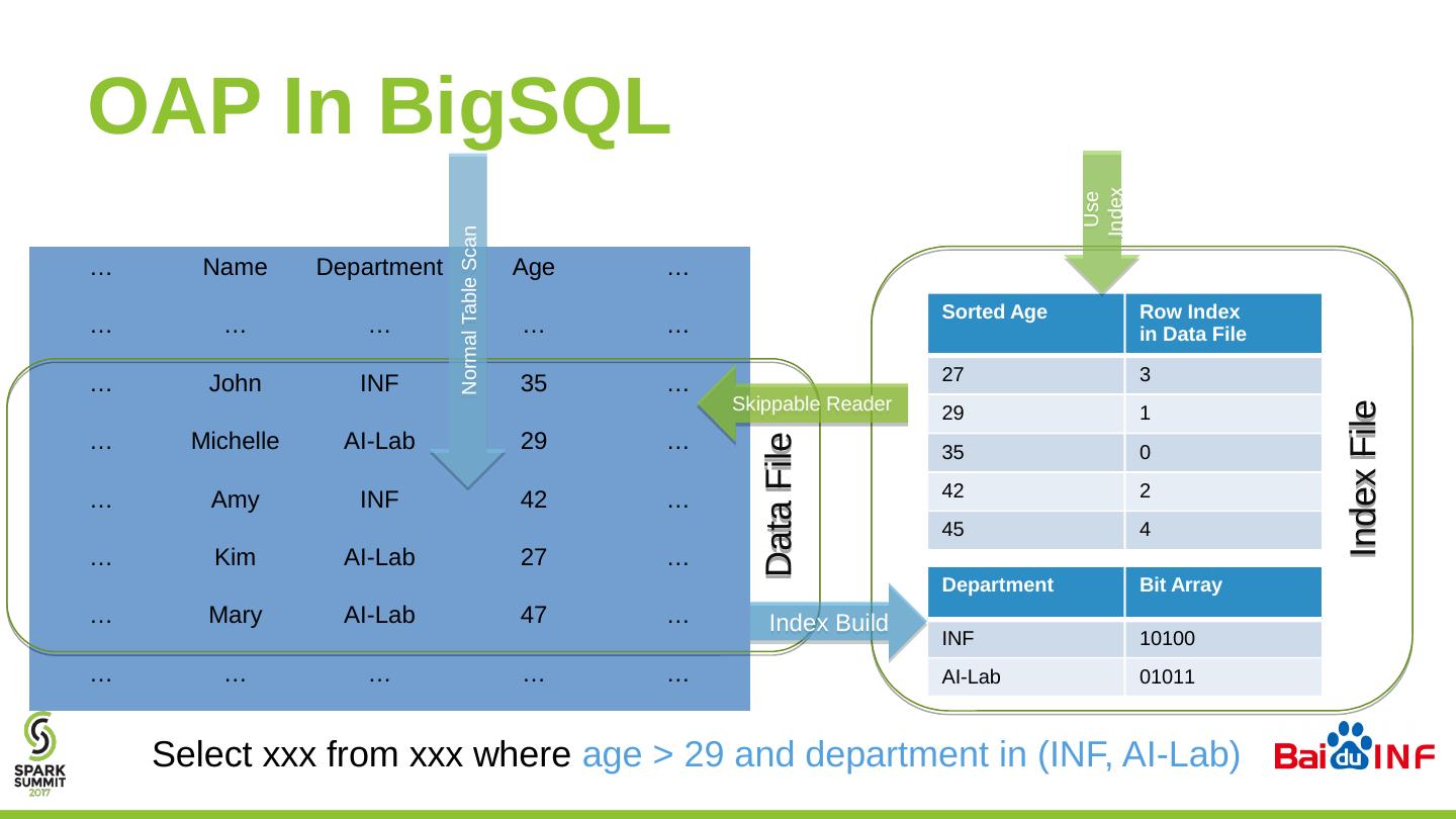 26 .OAP In BigSQL … Name Department Age … … … … … … … John INF 35 … … Michelle AI-Lab 29 … … Amy INF 42 … … Kim AI-Lab 27 … … Mary AI-Lab 47 … … … … … … Data File Index File Sorted Age Row Index in Data File 27 3 29 1 35 0 42 2 45 4 Department Bit Array INF 10100 AI-Lab 01011 Index Build Normal Table Scan Use Index Skippable Reader Select xxx from xxx where age > 29 and department in (INF, AI-Lab)
