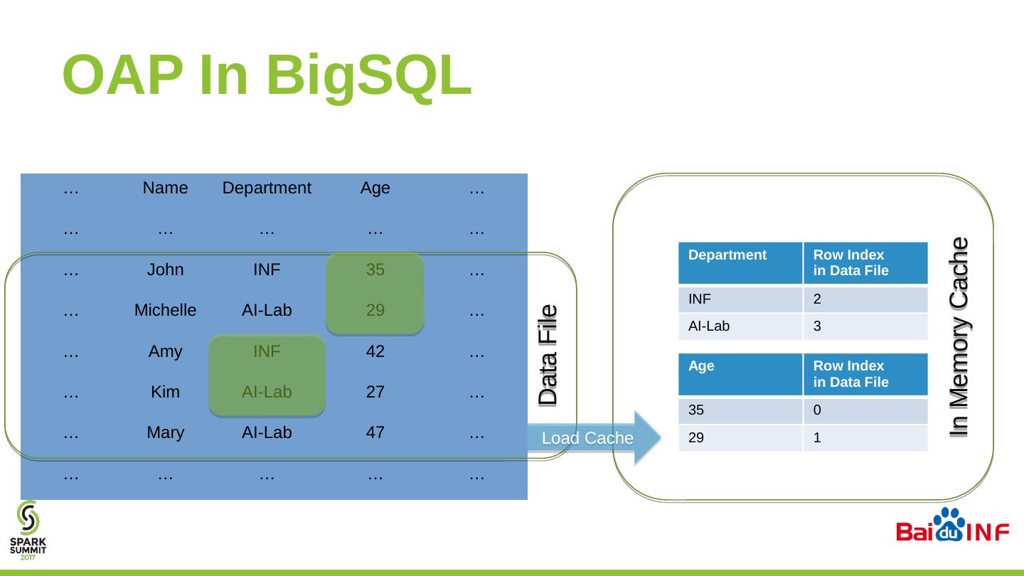27 .OAP In BigSQL … Name Department Age … … … … … … … John INF 35 … … Michelle AI-Lab 29 … … Amy INF 42 … … Kim AI-Lab 27 … … Mary AI-Lab 47 … … … … … … Data File In Memory Cache Load Cache Department Row Index in Data File INF 2 AI-Lab 3 Age Row Index in Data File 35 0 29 1