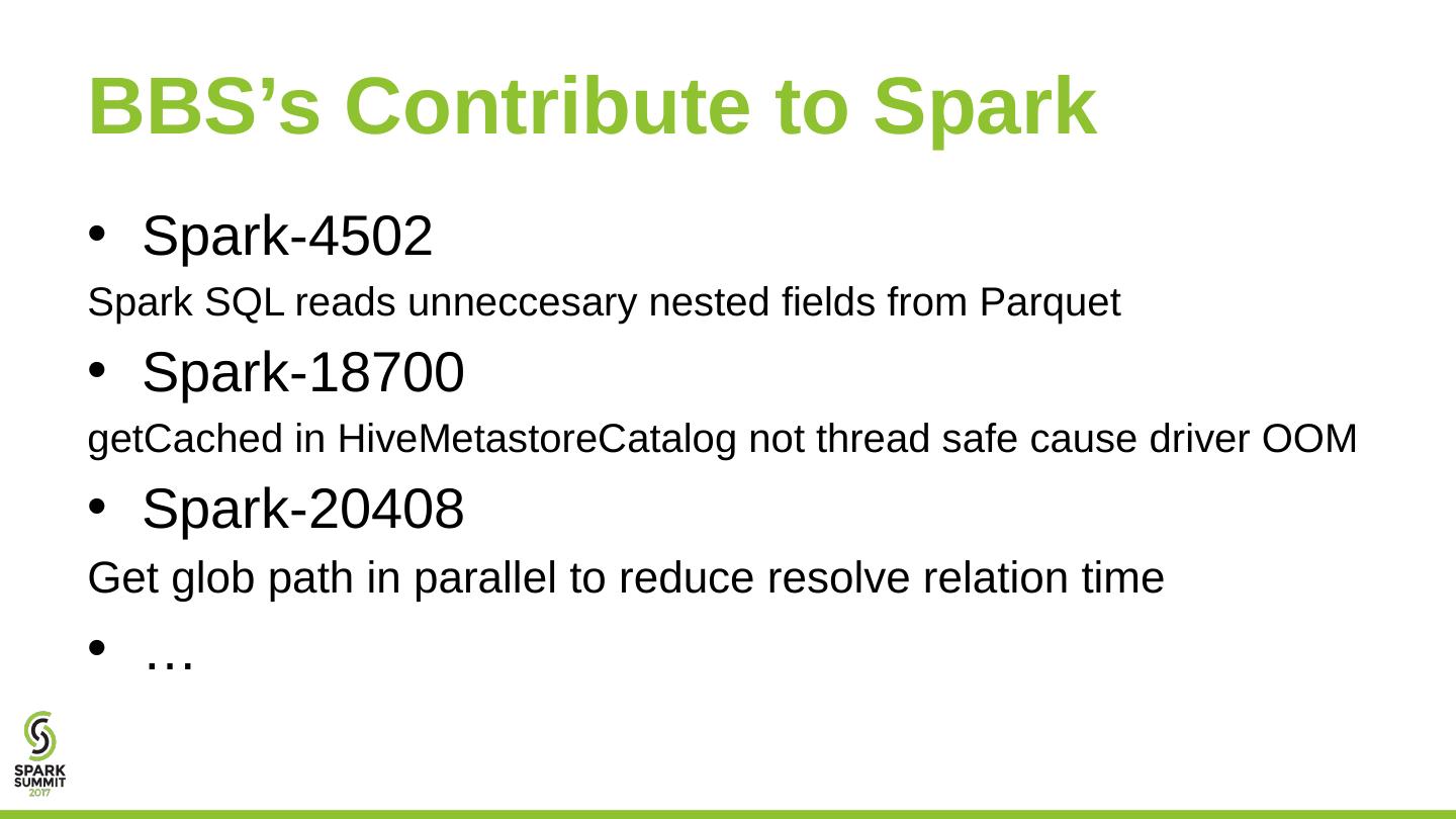 29 .BBS’s Contribute to Spark Spark-4502 Spark SQL reads unneccesary nested fields from Parquet Spark-18700 getCached in HiveMetastoreCatalog not thread safe cause driver OOM Spark-20408 Get glob path in parallel to reduce resolve relation time …