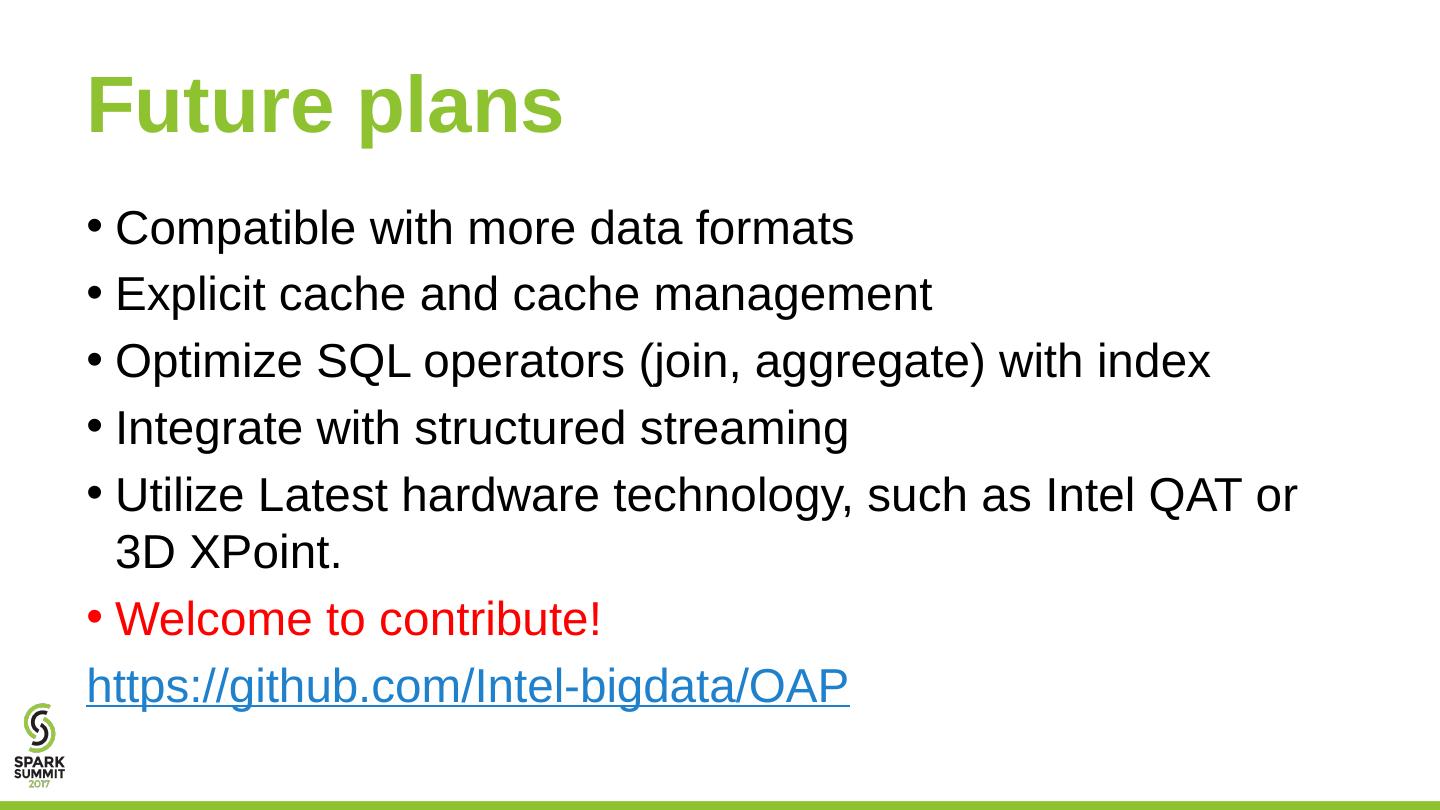 9 .Our proposal – OAP Spark* Job Server Spark SQL / Structured Streaming / Core Cassandra* HBase * Redis * Alluxio * HDFS * S3 * … Storage Layer Hive* Table Parquet * JSON * ORC * Redis * Connector Cassandra * Connector OAP (Codename “Spinach”) Indexed Data Source / Cache Aware RDMA, QAT, ISA-L, FPGA … User Customized Indices Columnar formats & support Parquet, ORC Runtime Computing V.S. Data Store Columnar Fine-grained Cache Spark Executor in-process Cache 3D X p oint (APP Direct Mode) Auto tuning based on periodical job history K8S Integration / AES-NI Encryption