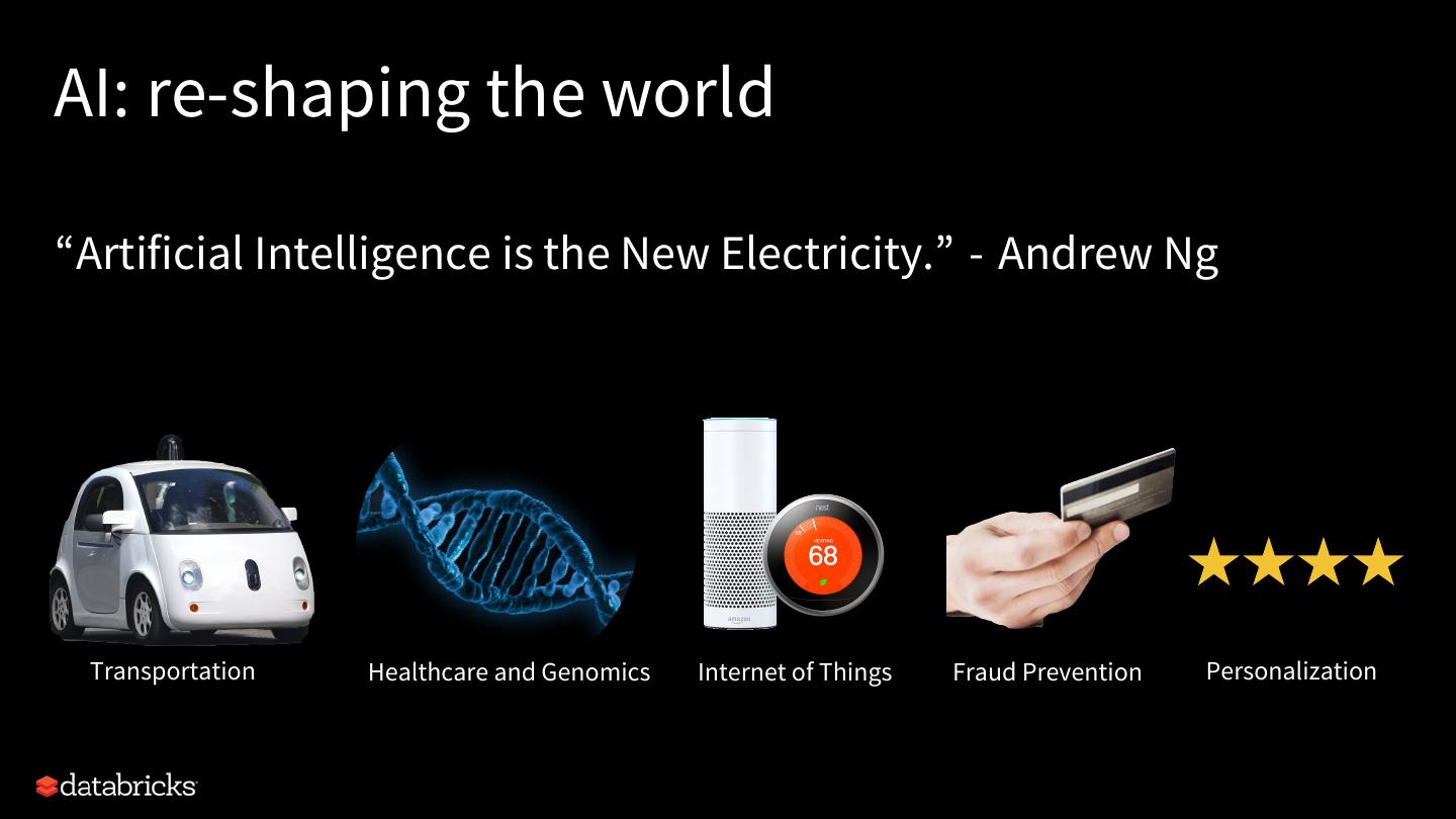 5 .AI: re-shaping the world “Artificial Intelligence is the New Electricity.” - Andrew Ng Transportation Healthcare and Genomics Internet of Things Fraud Prevention Personalization