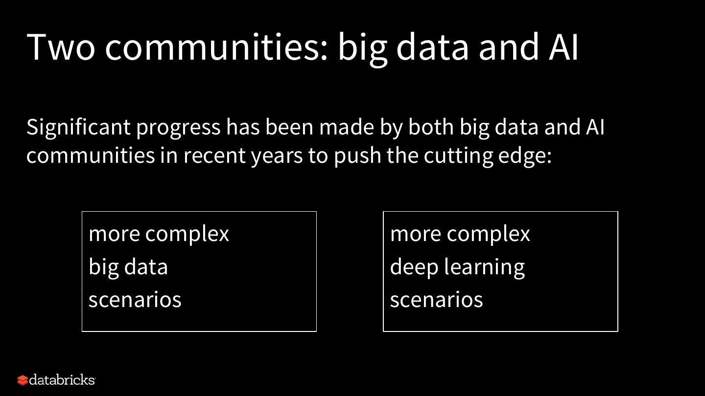 6 .Two communities: big data and AI Significant progress has been made by both big data and AI communities in recent years to push the cutting edge: more complex more complex big data deep learning scenarios scenarios